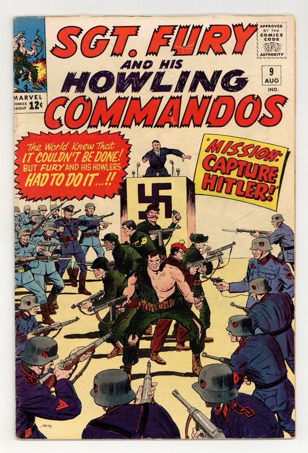 Cover art by Dick Ayers. Mission: Capture Adolf Hitler!, script by Stan Lee, pencils by Dick Ayers, inks by George Roussos [as Geo. Bell]; Fury and the Howling Commandoes are sent deep into Germany to capture Adolph Hitler. House ad for Daredevil #3 and Avengers series) #7. 36 pgs. $0.12. Cover price $0.12.