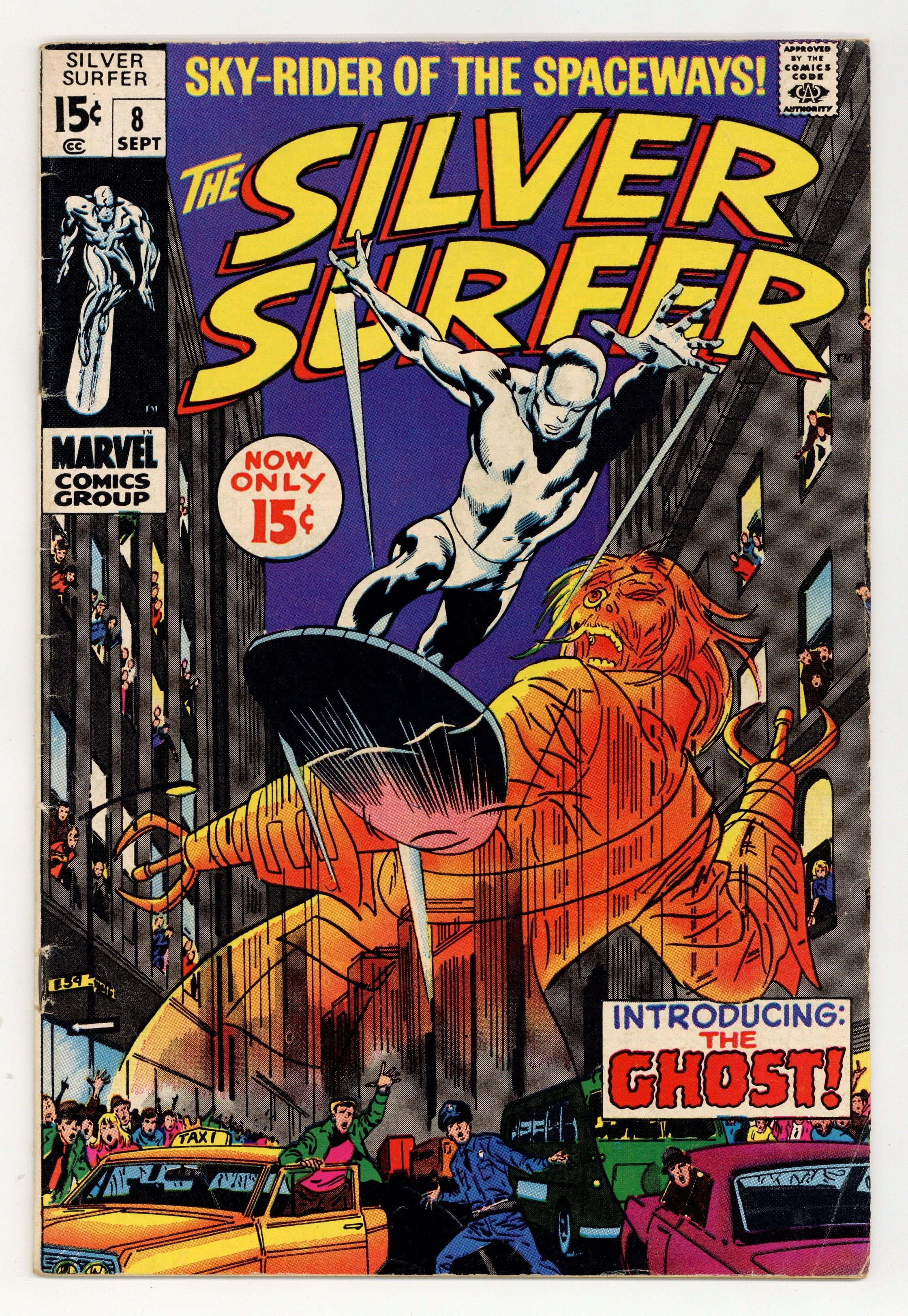 "Now Strikes the Ghost!" Part 1 of 2. Written by Stan Lee. Art by John Buscema and Dan Adkins. Mephisto, the very embodiment of evil, sends a powerful emissary, The Flying Dutchman, to destroy his hated enemy, the Silver Surfer. Cover price $0.15.