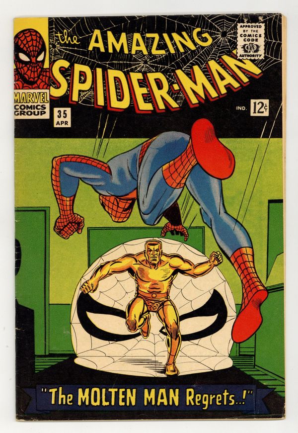 Cover pencils by Steve Ditko and Jack Kirby (Spider-Man figure), inks by Steve Ditko and Sol Brodsky (Spider-Man figure). The Molten Man Regrets...!, script by Steve Ditko (plot) and Stan Lee (script), art by Steve Ditko; The Molten Man is released from jail and he decides he is going to be smarter about his next robbery, but Spider-Man puts an end to his plans. Ad for Hulk T-Shirt and other MMMS items, art by Steve Ditko, Jack Kirby, and Frank Giacoia. Reprinted in Marvel Tales # 28 and 174. 36 pgs., full color. $0.12. Cover price $0.12.
