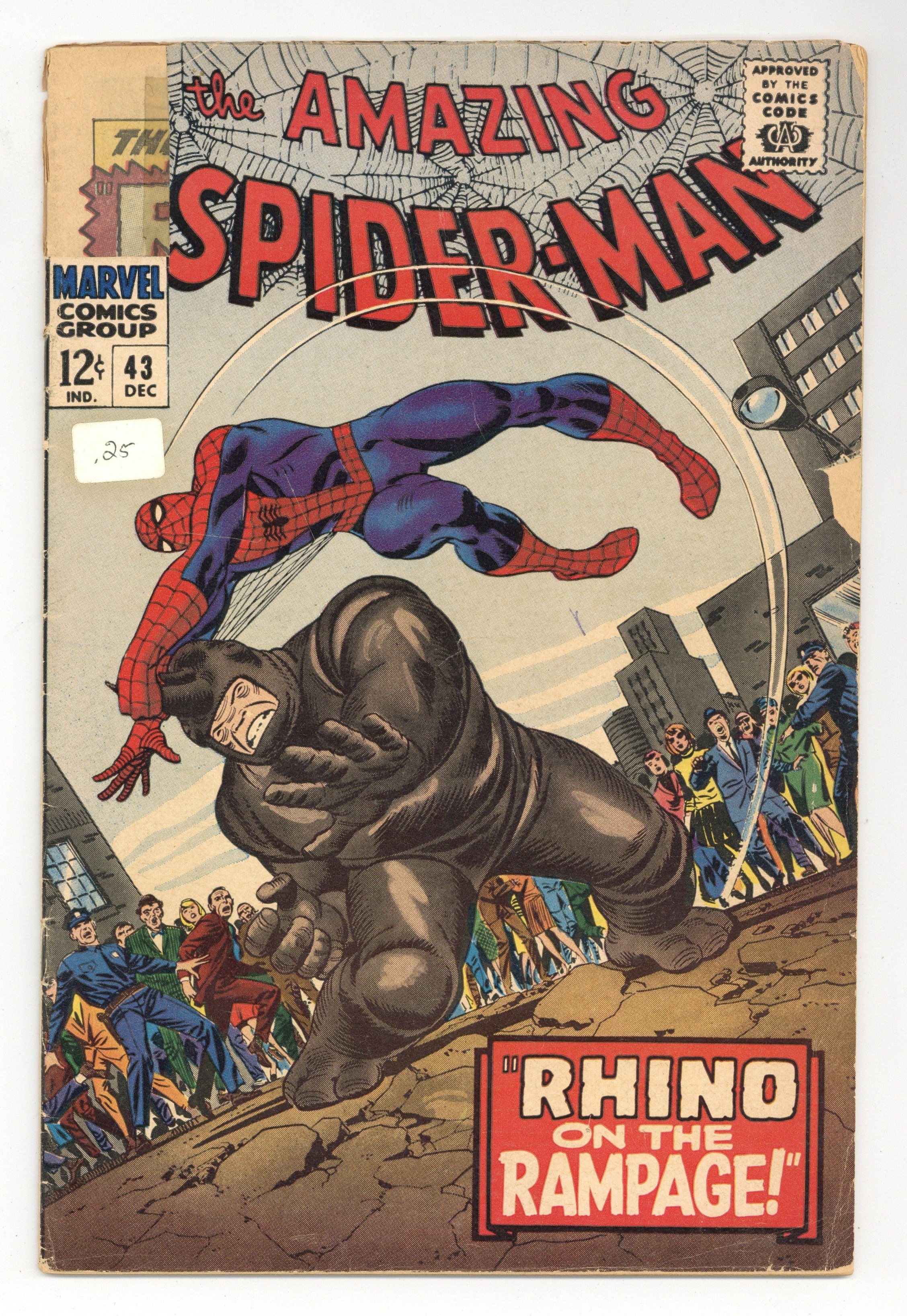 1st full appearance of Mary Jane (cameos in #25,38, & 42). Cover by John Romita Sr.. MJ has her first in-depth interaction with Peter Parker, plus cameos by Foggy Nelson and Matt Murdock (Daredevil) in Rhino on the Rampage!, script by Stan Lee, art by John Romita Sr.; Rhino escapes from police custody and is looking for revenge on Spider-Man for defeating his attempt to kidnap John Jameson. Reprinted in Marvel Tales # 32 and 183. 36 pgs., full color. $0.12. Cover price $0.12.