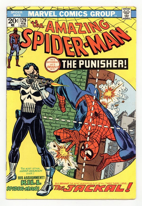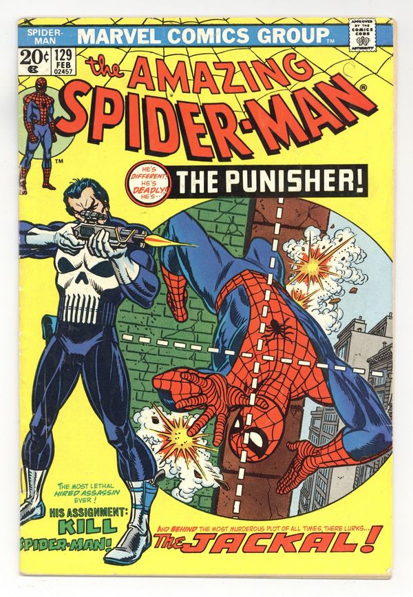 First appearances of the Punisher and the Jackal in "The Punisher Strikes Twice!" Script by Gerry Conway. Pencils by Ross Andru. Inks by Frank Giacoia and Dave Hunt (backgrounds). Cover by Gil Kane and John Romita. One of the landmark issues of the bronze age! The Punisher, the legendary gun-toting vigilante, makes his first appearance in the Marvel Universe! And his first target...is none other than your friendly neighborhood Spider-Man! But before Frank Castle can locate the web-slinger, he needs directions from a mysterious new super-villain called the Jackal! Once the dastardly Jackal tells the sharpshooting anti-hero where to find the wall-crawler, the inaugural battle between the Punisher and the Amazing Spider-Man erupts! The first of many classic confrontations! Cameo appearances by Mary Jane Watson, Harry Osborn, Betty Brant, Joe Robertson, and J. Jonah Jameson. (Notes: The Punisher appears next in Amazing Spider-Man 134 (cameo) and 135. The letters page includes a letter from comics writer Ralph Macchio. This story was reprinted in Marvel Tales 106 and again in Marvel Tales 209.) 36 pages. 20 cent cover price. Cover price $0.20.