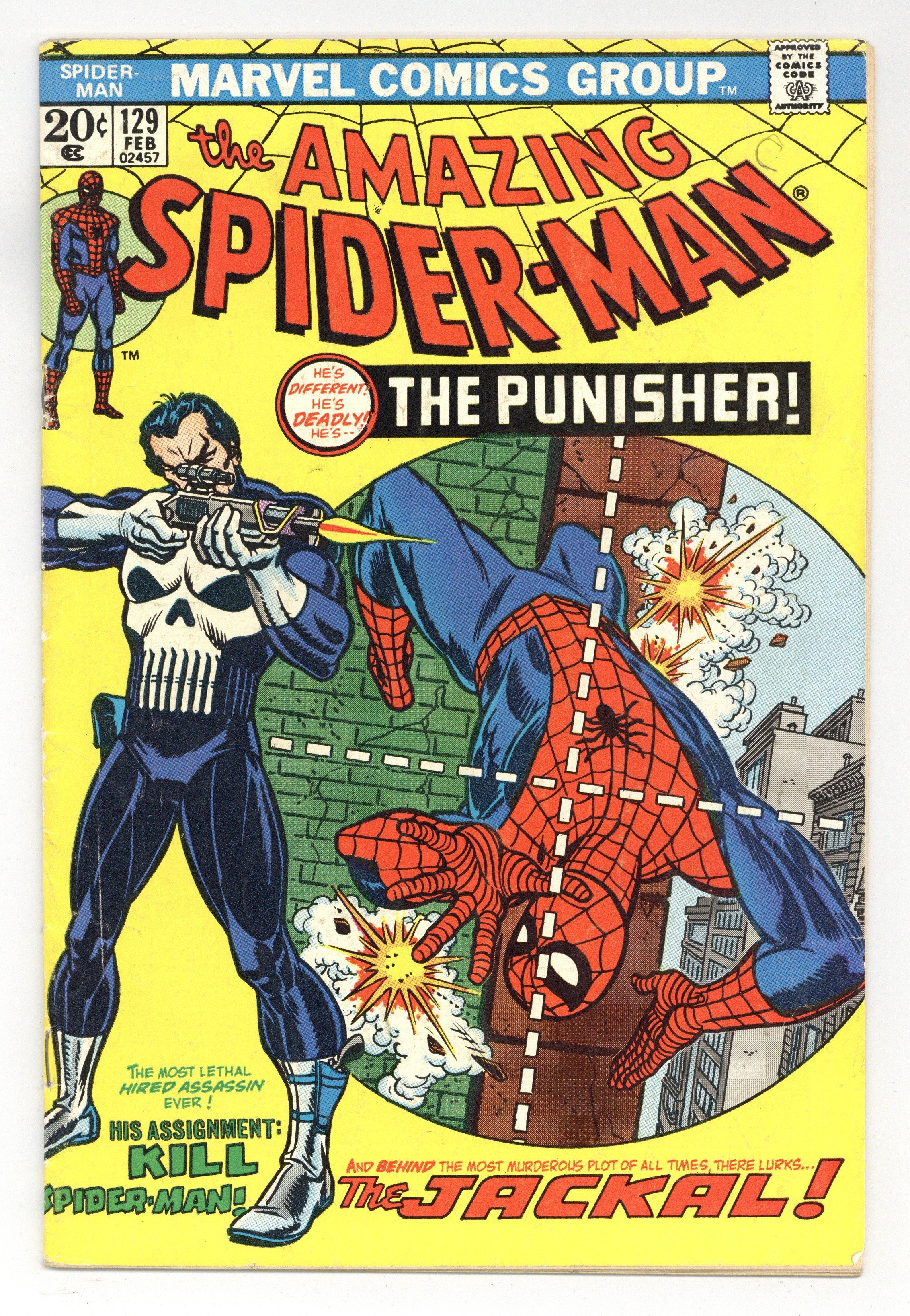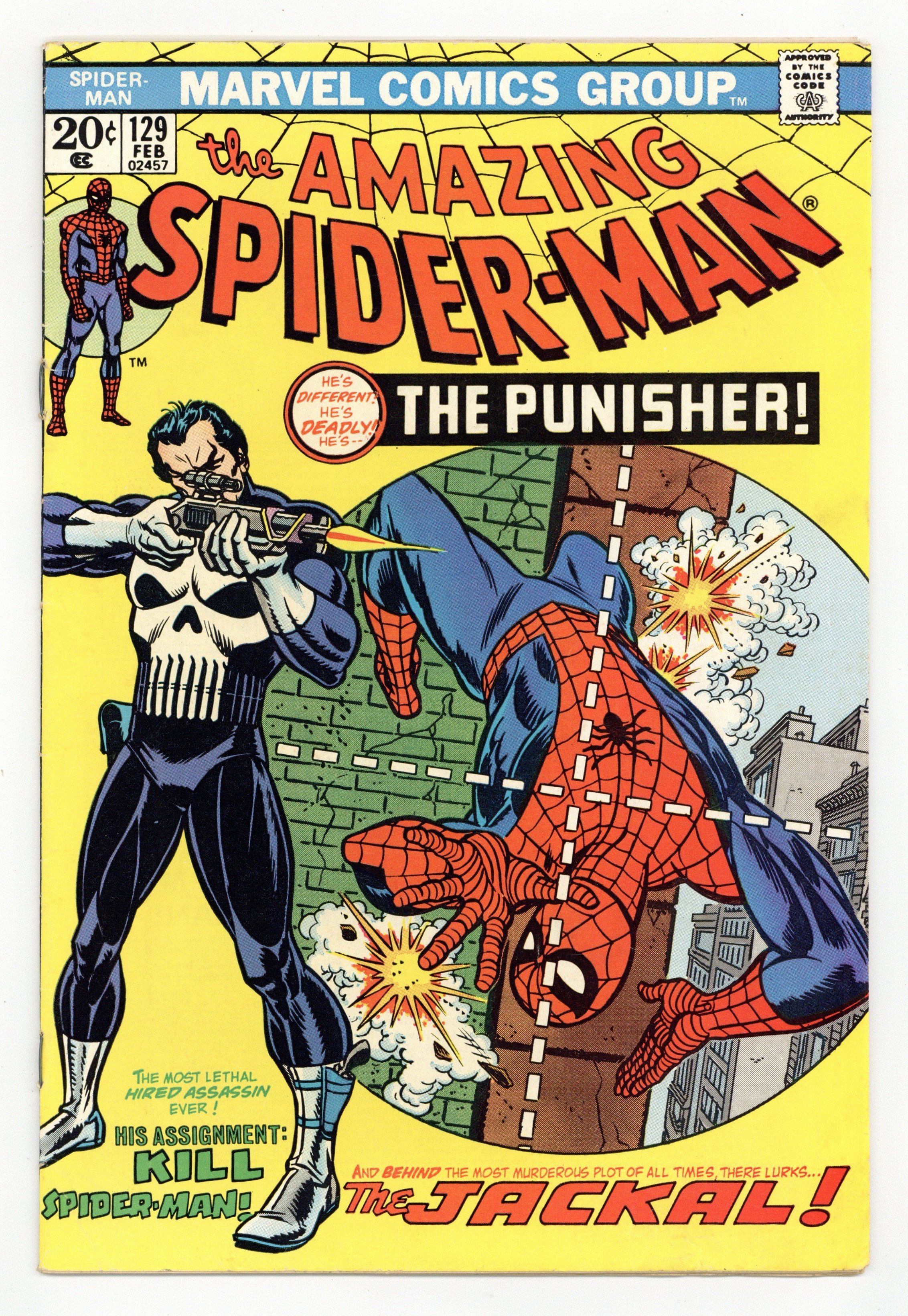 Tags: Marvel Legacy Numbering: Amazing Spider-Man (part 129), Spider-Man$1,100.00First appearances of the Punisher and the Jackal in "The Punisher Strikes Twice!" Script by Gerry Conway. Pencils by Ross Andru. Inks by Frank Giacoia and Dave Hunt (backgrounds). Cover by Gil Kane and John Romita. One of the landmark issues of the bronze age! The Punisher, the legendary gun-toting vigilante, makes his first appearance in the Marvel Universe! And his first target...is none other than your friendly neighborhood Spider-Man! But before Frank Castle can locate the web-slinger, he needs directions from a mysterious new super-villain called the Jackal! Once the dastardly Jackal tells the sharpshooting anti-hero where to find the wall-crawler, the inaugural battle between the Punisher and the Amazing Spider-Man erupts! The first of many classic confrontations! Cameo appearances by Mary Jane Watson, Harry Osborn, Betty Brant, Joe Robertson, and J. Jonah Jameson. (Notes: The Punisher appears next in Amazing Spider-Man 134 (cameo) and 135. The letters page includes a letter from comics writer Ralph Macchio. This story was reprinted in Marvel Tales 106 and again in Marvel Tales 209.) 36 pages. 20 cent cover price. Cover price $0.20.