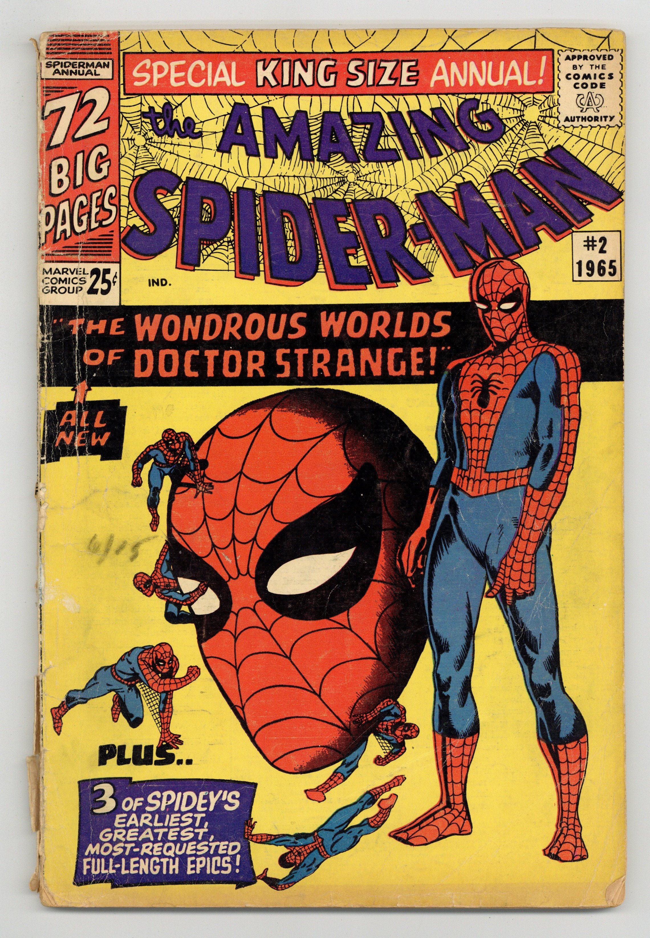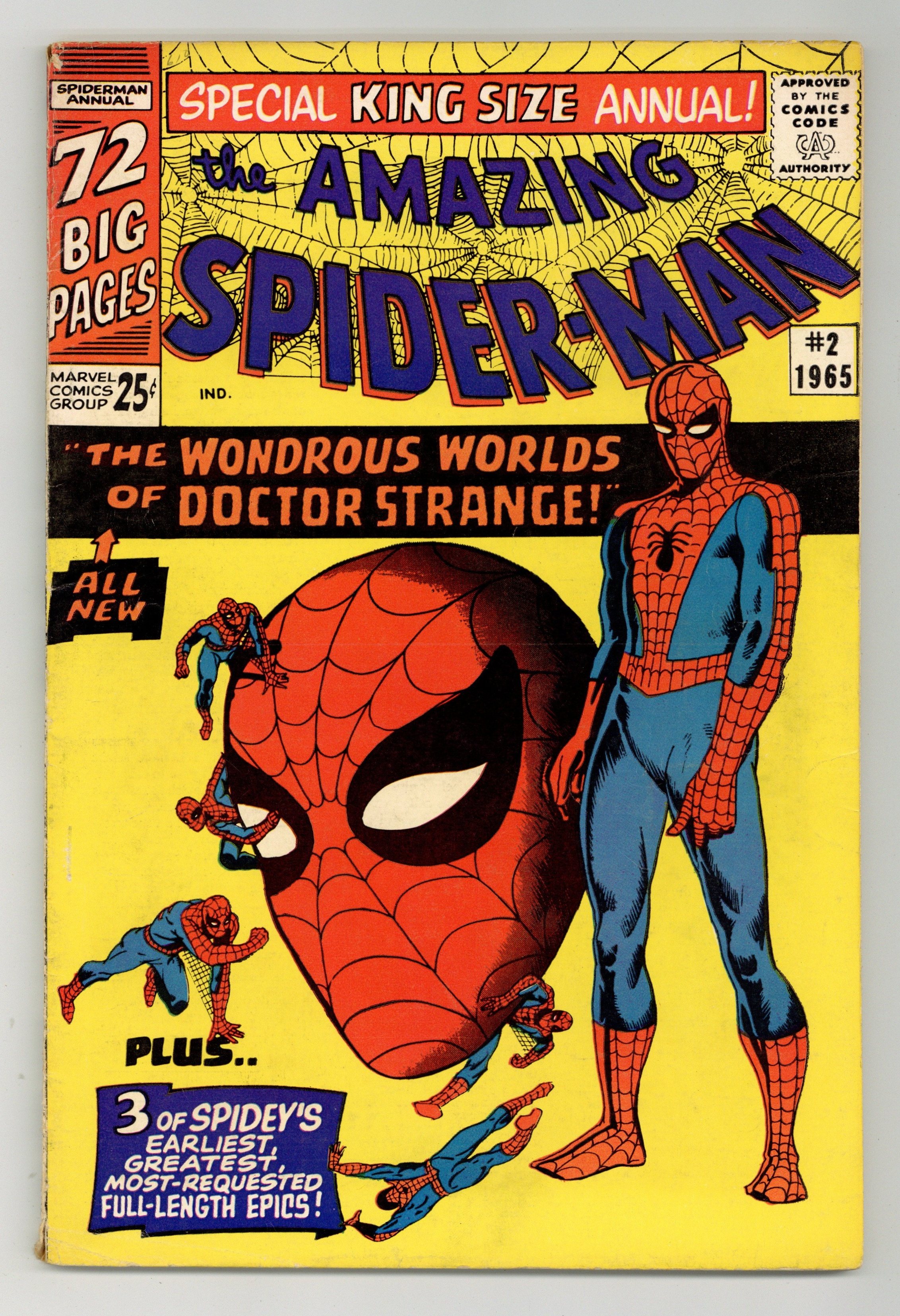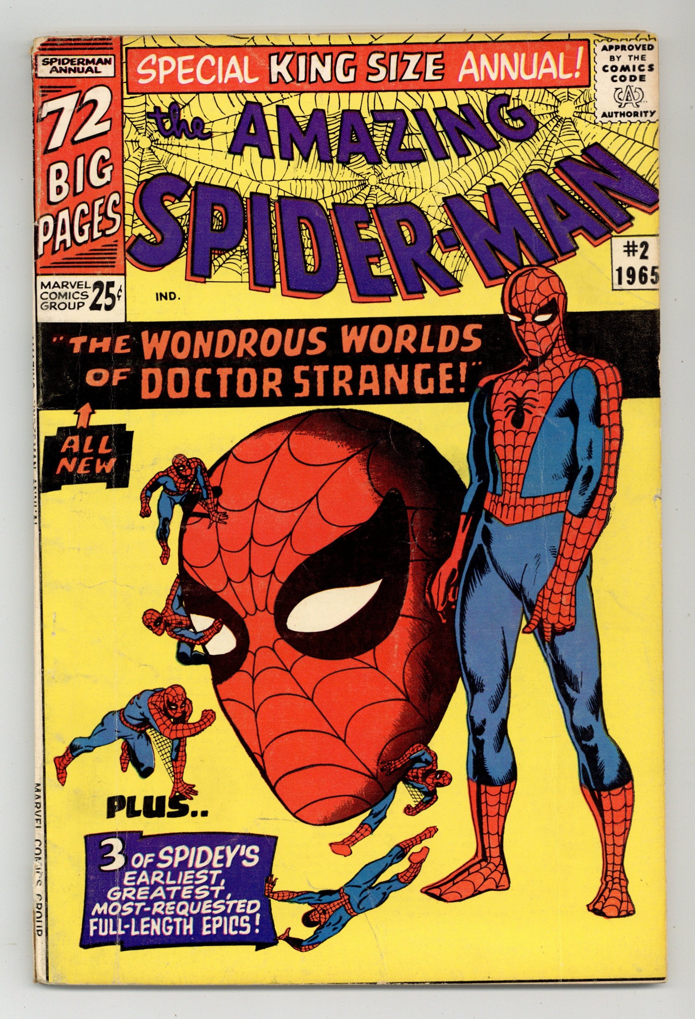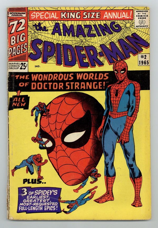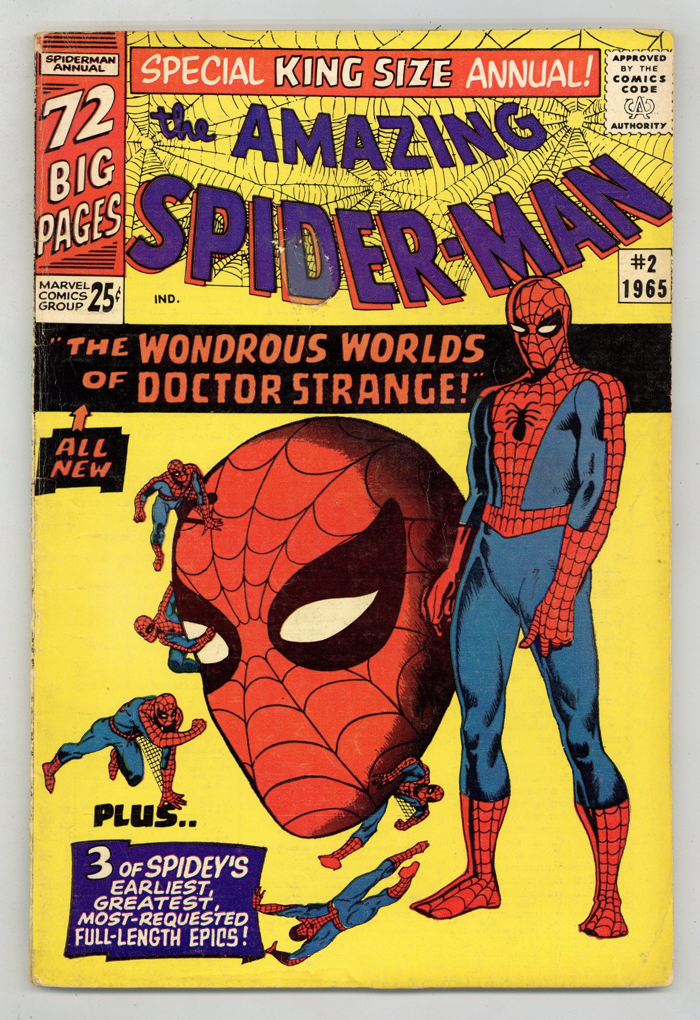Cover art by Steve Ditko. Doctor Strange guest stars in an all-new 20-page story, "The Wondrous World of Doctor Strange!", script by Stan Lee, art by Steve Ditko; Xandu sends his two henchmen to retrieve half of the Wand of Watoomb from Dr. Strange; Spider-Man mistakes the henchmen for burglars and tries to stop them, leading to a team up between Spider-Man and Dr. Strange to stop Xandu's plan. Spider-Man, script by Stan Lee, art by Steve Ditko; Spider-Man rescues John Jameson, J. Jonah Jameson's son, from his malfunctioning space capsule; reprinted from Amazing Spider-Man 1. The Uncanny Threat of the Terrible Tinkerer!, script by Stan Lee, art by Steve Ditko; When Peter Parker discovers some alien modifications to a professor's radio he tracks down a group of aliens with plans to take over the Earth; reprinted from Amazing Spider-Man 2. Marked for Destruction by Dr. Doom!, script by Stan Lee, art by Steve Ditko; Dr. Doom tries to trick Spider-Man into helping him defeat the Fantastic Four. Ditko also provides 5 pages of new pin-ups (Spider-Man's famous foes). Finally, there are three reprints from Amazing Spider-Man 1 ("Spider-Man"), 2 ("The Uncanny Threat of the Terrible Tinkerer!"), and 5 ("Marked for Destruction by Dr. Doom!"). Giant 76-page special! Reprinted in Marvel Tales # 167. 76 pgs., full color. Cover price $0.25.