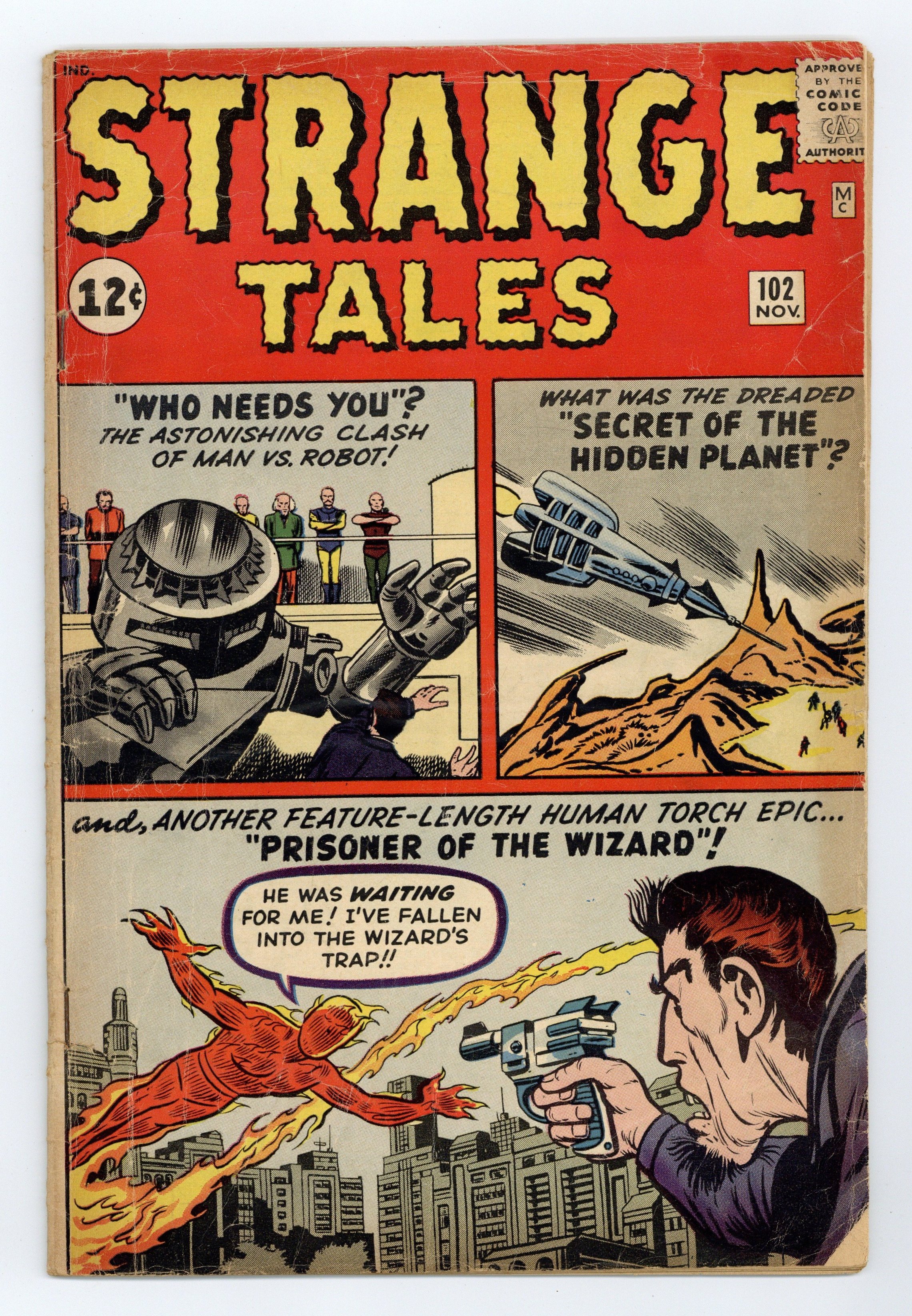 Cover pencils by Jack Kirby, inks by Dick Ayers. The Human Torch stars in "Prisoner of the Wizard," script by Stan Lee (plot) and Larry Lieber (script), pencils by Jack Kirby, inks by Dick Ayers; The Human Torch is tricked and trapped by the renowned genius the Wizard, who impersonates the Torch to frame him for crimes. "The Treasure" text story. "The Secret of the Hidden Planet!", pencils by Gene Colan; Human-like aliens are seen on Venus, and a wicked pilot poisons his rival to be able to make first contact. "Who Needs You?", script by Stan Lee, art by Steve Ditko; A general who has the responsibility of launching a nuclear counter attack is replaced by a robot that his bosses think is more suited for a role that requires perfection; When an unidentified radar object approaches at ICBM speed, the robot concludes that it must be a Soviet first strike and prepares to launch a counter attack. 36 pgs., full color. Cover price $0.12.