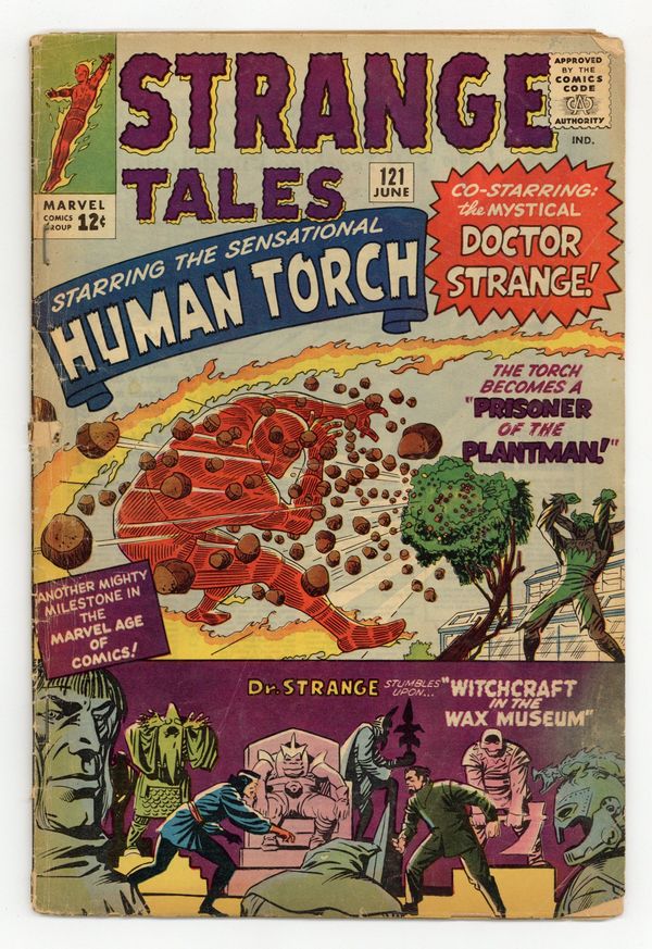 Starts Feb 2 Cover art by Jack Kirby/Ditko (Ditko by himself on the Dr. Strange half). The Human Torch faces the weed of crime, AKA the Plantman, in "Prisoner of the Plantman!", script by Stan Lee and Dick Ayers (co-plot), art by Dick Ayers; After improving his plant ray, The Plantman captures Johnny to get him out of the way while he pulls a robbery; After, Doris, worried about her father, begs Johnny to stop the villain; They have a duel at the Botanical Gardens. "Witchcraft in the Wax Museum!", script by Stan Lee and Steve Ditko (co-plot), art by Steve Ditko; A phone call lures Strange away in his ectoplasmic form, so Baron Mordo can steal his body; Knowing that if the two are not reunited in 24 hours Strange is doomed, Mordo places a spell over the body so Strange cannot return to it. The second page of a 2-page text story, "The Salesman." Statement of ownership--average print run 321,212; average paid circulation 189,160. 36 pgs., full color. Cover price $0.12.