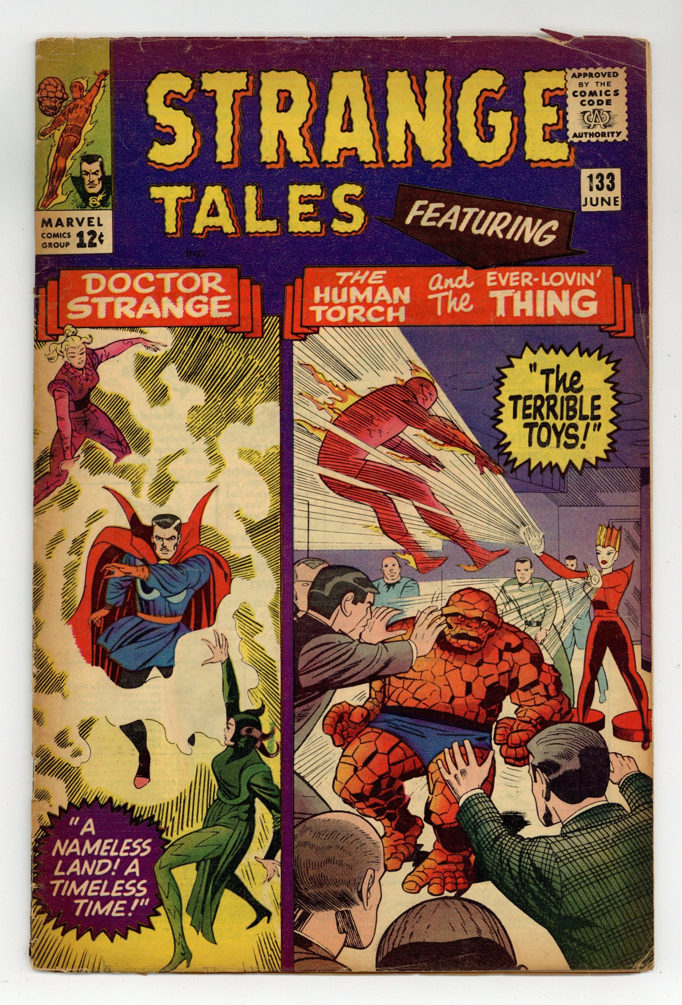 Cover pencils by Jack Kirby, inks by Mike Esposito. The Human Torch and the Thing star in "The Terrible Toys!", script by Stan Lee (plot, dialogue) and Bob Powell (plot), pencils by Bob Powell, inks by Mike Esposito (as Mick Demeo); Deciding to switch his M.O., The Puppet Master builds robotic "statues" he can control, and undergoes plastic surgery so no one will recognize him; The masquerade is short-lived, as he lures Johnny & Ben into a trap in a department store. "A Nameless Land, a Timeless Time!", script by Steve Ditko (plot) and Stan Lee (dialogue), art by Steve Ditko; After escaping from Mordo, Strange plummets thru dimension after dimension, finally coming to a stop in a world ruled by Shazana, a female tyrant who once conned a wizard into giving her some of his powers, which she repaid by destroying him; Believing her sister has recruited Strange to overthrow her she battles Strange into submission; Appearances by Clea, Dormammu, and Baron Mordo. 36 pgs., full color. Cover price $0.12.