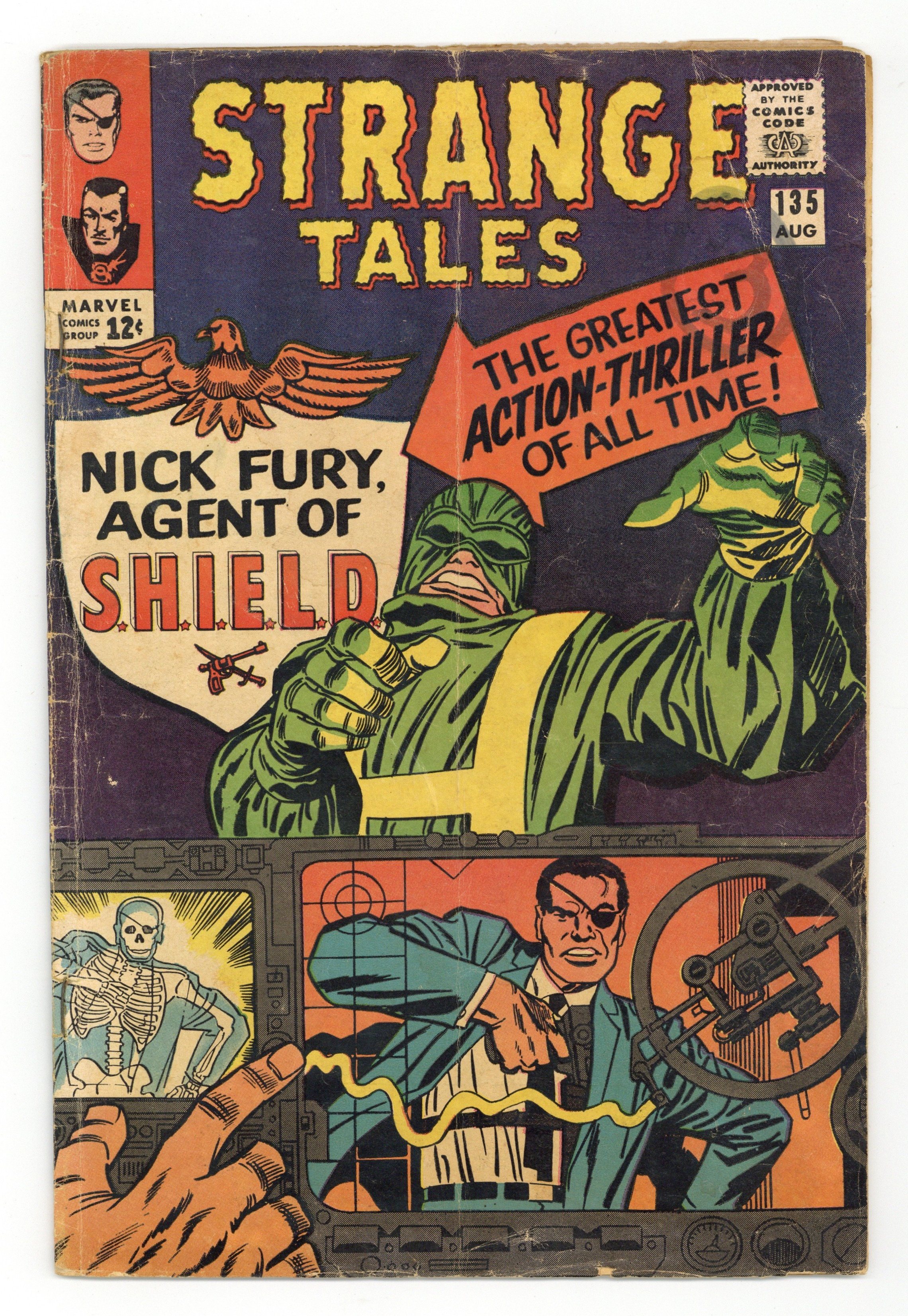Cover pencils by Jack Kirby, inks by Frank Giacoia. "The Man for the Job!", script by Stan Lee and Jack Kirby (co-plot), pencils by Jack Kirby, inks by Dick Ayers; Nick Fury reports to the Pentagon, encountering Life Model Decoys: replicas of himself; He is driven in a gadget-filled car that converts to flying mode; Fury learns about SHIELD, an international organization whose job is to stop HYDRA, fanatics bent on world domination; Fury meets Tony Stark, in charge of SHIELD's weaponry, who tells Fury he was chosen to lead SHIELD. "Eternity Beckons!", script by Steve Ditko (plot) and Stan Lee (dialogue), art by Steve Ditko; In London, seeking info on "Eternity," Dr. Strange goes to the secluded home of Sir Baskerville, a former disciple of Mordo's, who greets him as an old friend; Meanwhile, Dormammu discovers that Clea set the Mindless Ones free and swears she will pay for her betrayal; Baskerville contacts Mordo, who sends an emissary to trap Strange but it backfires, allowing Strange to discover that Dormammu is the one behind Mordo's attacks and increased power. Notes: 1st S.H.I.E.L.D., 1st Hydra, 1st Nick Fury as agent of shield, 1st appearance of LMD (Life Model Decoy). 36 pgs., full color. Cover price $0.12.