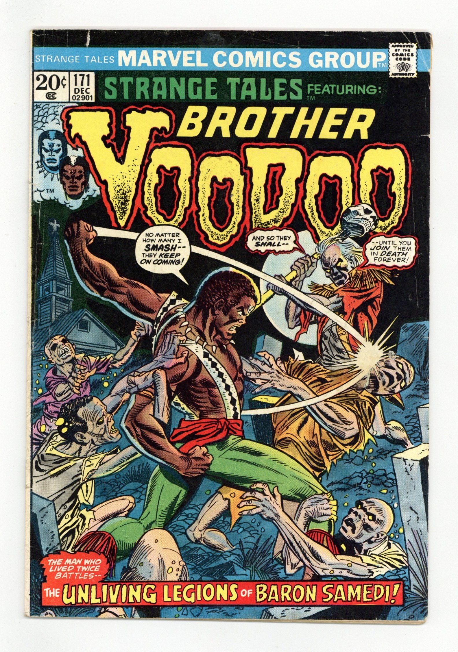 Cover pencils by Gil Kane, inks by Frank Giacoia. "March of the Dead," script by Len Wein, pencils by Gene Colan, inks by Frank Giacoia; Brother Voodoo has been summoned to Haiti to investigate reports of Zuvembies attacking factories across the island; Going to a local grave yard he is attacked by these apparent undead soldiers and their leader: Baron Samdei; During the fight, Brother Voodoo is knocked out; While he is unconscious he reflects back on the events that brought him to Haiti, and of the Zuvembie that was in captivity of the local authorities. Ad for Astonishing Tales # 21. 36 pgs., full color. Cover price $0.20.