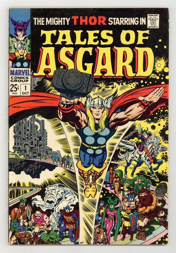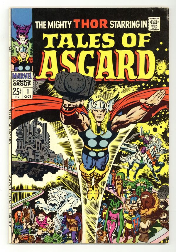 Giant-size issue. Tales of Asgard collects and reprints the back-up stories featured in Journey into Mystery. Stories by Stan Lee and Jack Kirby. Asgard is the home of the Aesir, the mighty Norse Gods. These stories are based on these immortal legends and include the creation of the gods and their enemies the evil frost giants. Learn the legend of Baldur the Brave and of Heimdall, Guardian of the fabled Rainbow Bridge. Also witness how the almighty Odin defeats the fire demon Surtur, and follow a young godling by the name of Thor, he who one day would become known as the God of Thunder, as he grows and finds his place in the realms. Cover price $0.25.