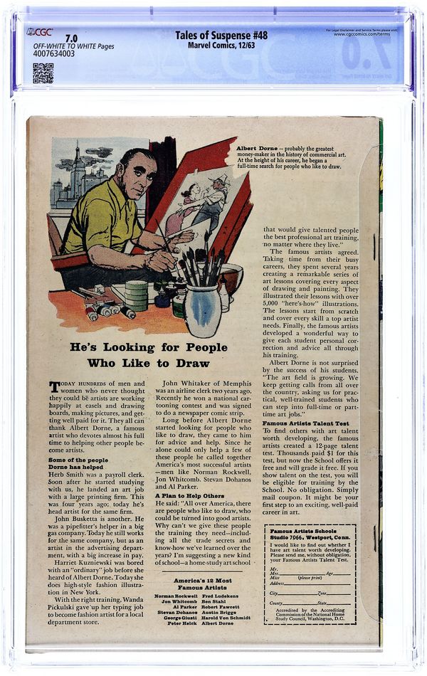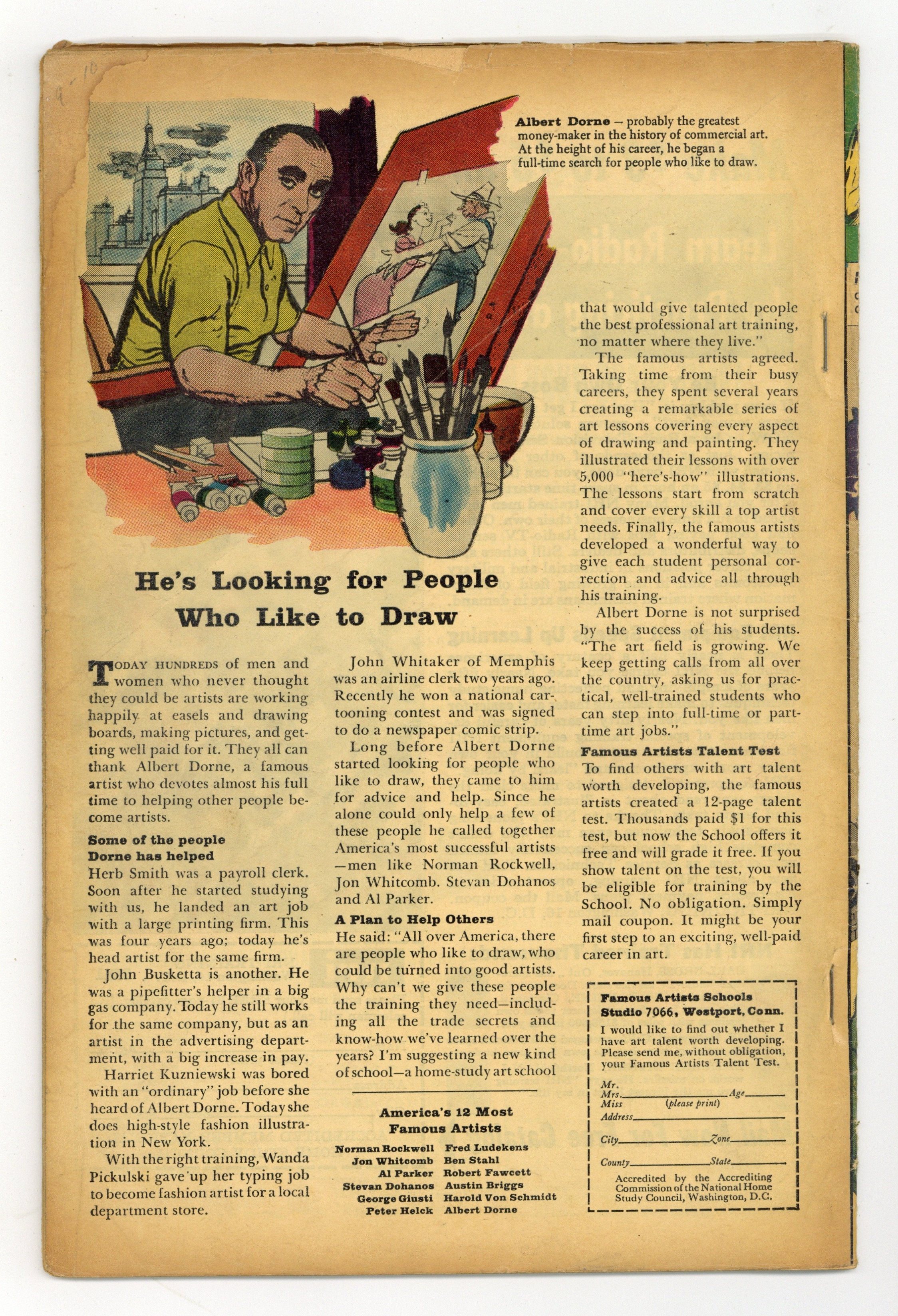 Cover pencils by Jack Kirby, inks by Sol Brodsky. Iron Man gets a snazzy new costume in "The Mysterious Mr. Doll!", script by Stan Lee, pencils by Steve Ditko, inks by Dick Ayers; Mister Doll uses magic dolls to take over whole companies; Iron Man stops him with the help of a new suit of armor. "The Pact," art by Joe Maneely; An historian writing about the trial and execution of his ancestor for witchcraft interviews the only remaining party concerned in the case: the Devil. "Kraddak," script by Stan Lee (plot) and Larry Lieber (script), pencils by Larry Lieber, inks by George Roussos (as G. Bell); An alien tells a greedy mine owner that he will be killed in a fall; The mine owner hides at the lowest possible point in his mine. 36 pgs., full color. $0.12. Cover price $0.12.