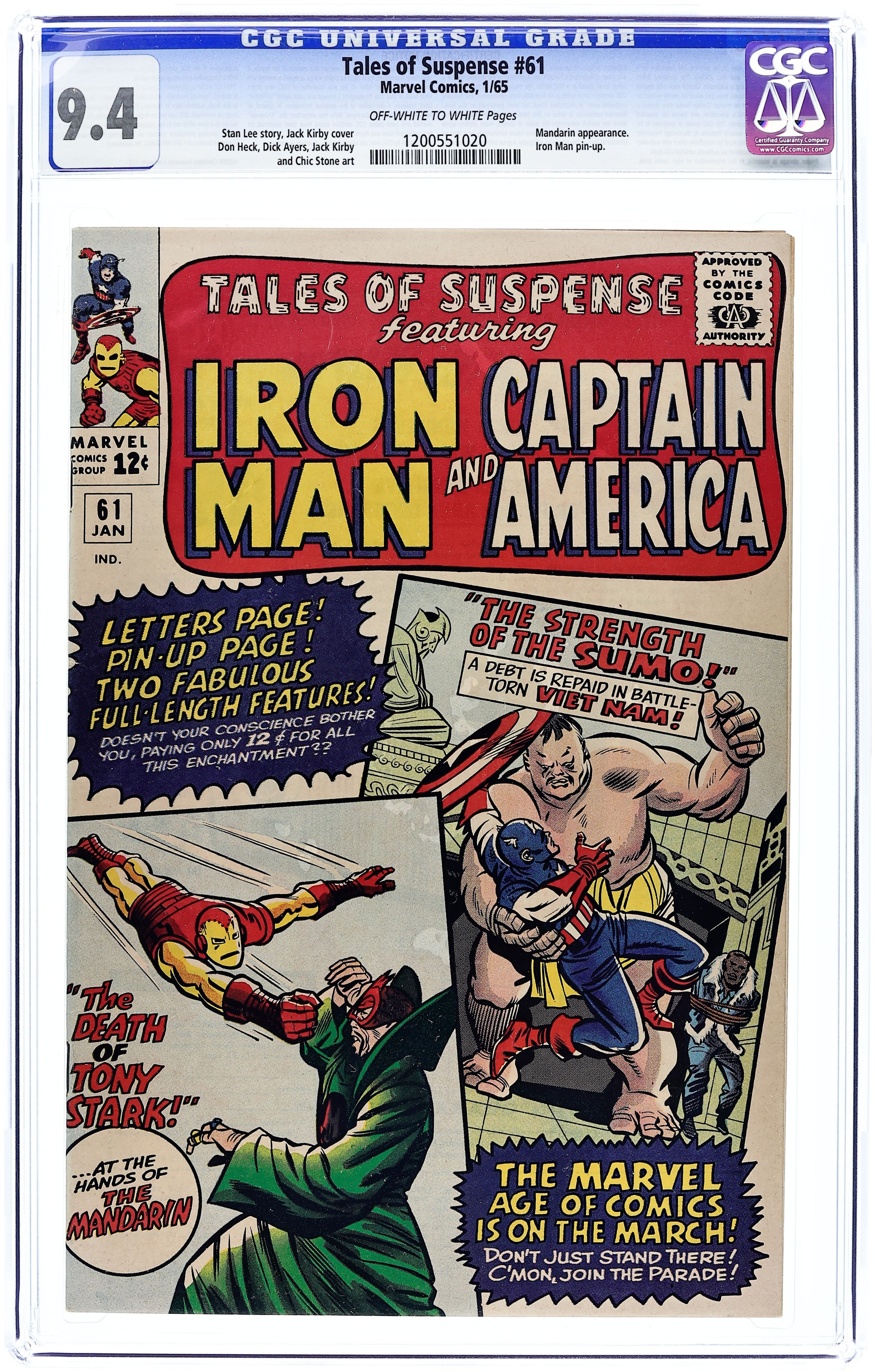Cover pencils by Jack Kirby, inks by Chic Stone. "The Death of Tony Stark!", script by Stan Lee, pencils by Don Heck, inks by Dick Ayers; Iron Man versus Mandarin and his giant robot Koto. Iron Man pinup by Don Heck. "The Strength of the Sumo!", script by Stan Lee, pencils by Jack Kirby, inks by Chic Stone; Captain America goes into Viet Nam to rescue prisoner of war Baker, and must face the Sumo. Letter from Pete Von Sholly (future comics artist). 36 pages, full color. Cover price $0.12.