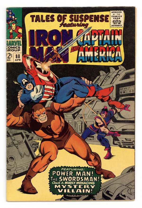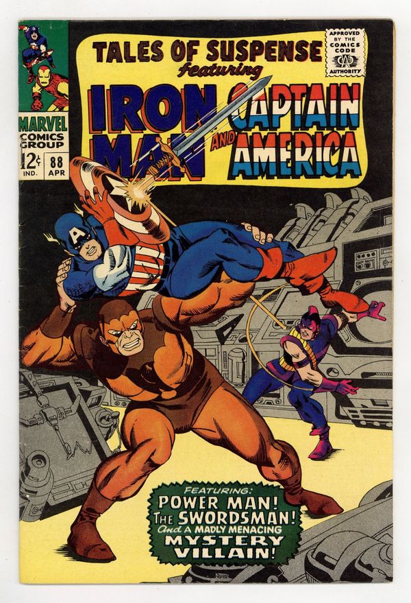 Tags: Marvel Legacy Numbering: Captain America (part 88), Marvel Legacy Numbering: Tales of Suspense (part 88), Captain America, Iron Man$13.00Cover by Gil Kane. "Beyond All Rescue!", script by Stan Lee, pencils by Gene Colan, inks by Frank Giacoia; Iron Man and Pepper try to escape Mole Man's subterranean world; The subterraneans kidnap Pepper; Iron Man follows them to the Mole Man, and then pretends to agree to give the Mole Man his earth digger; Iron Man then flies Pepper out as the digger explodes, burying the Mole Man and destroying Stark's factory. "If Bucky Lives..!", script by Stan Lee, art by Gil Kane; The Red Skull (behind the scenes) sets a trap for Captain America by showing him a robot duplicate of Bucky; "Bucky" says that he's been held a prisoner for years and needs Captain America to save him, saying he's on Seagull Island; Caps ship is caught in a plastic bubble just like the one which brought Power Man and Swordsman to the island; The story crosses over with Avengers #38; Appearances by Power Man and the Swordsman. 36 pages, full color. Cover price $0.12.