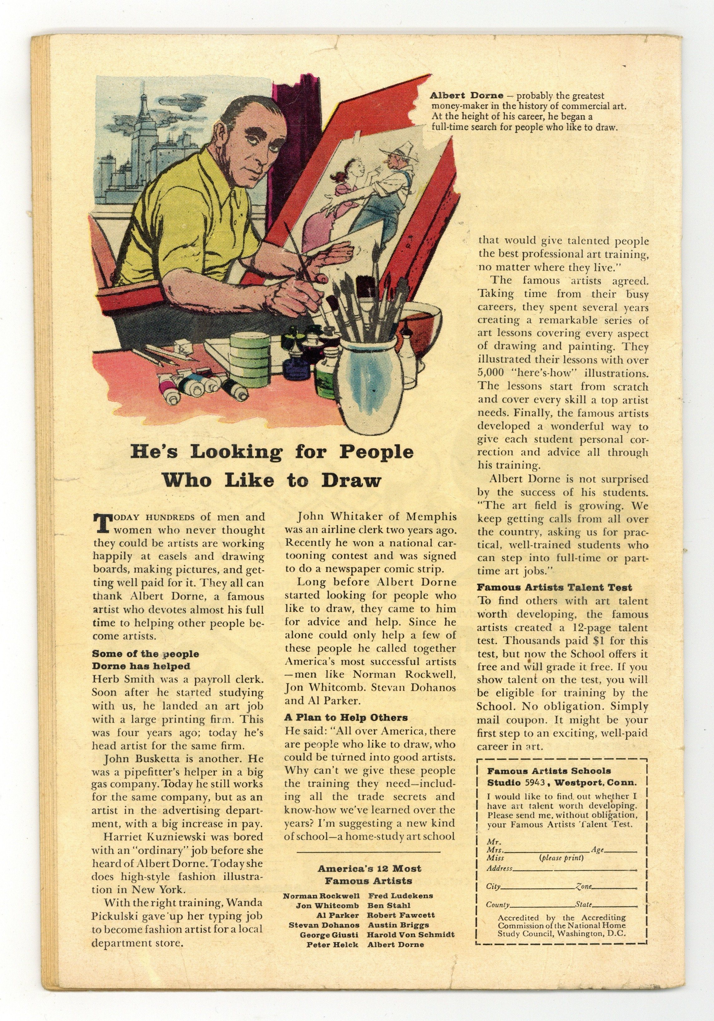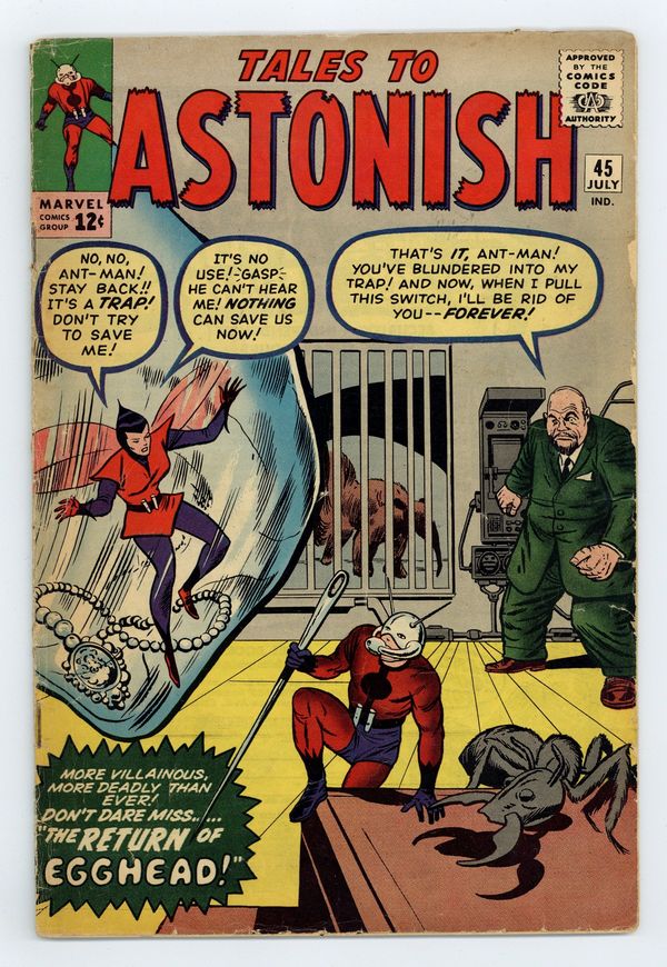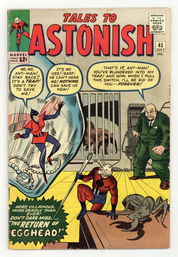 Cover by Jack Kirby and Dick Ayers. The Terrible Traps of Egghead!, script by Stan Lee and Ernie Hart [H. E. Huntley], art by Don Heck; Egghead forms a new gang and sets a trap for the Wasp, hoping to use her against Ant-Man. The Future text story. Bronson's Brain!, script by Stan Lee, art by Steve Ditko; Bronson, an incredible genius upset that no one on earth can match his tremendous intellect, builds a space ship and travels to a planet of highly advanced aliens. It Walks Like a Man!, script by Stan Lee and Robert Bernstein [as R. Berns], art by Paul Reinman; A man is disturbed by his daughter's attachment to her new robot playmate, but changes his mind when it saves her life. 36 pgs., full color. $0.12. Cover price $0.12.