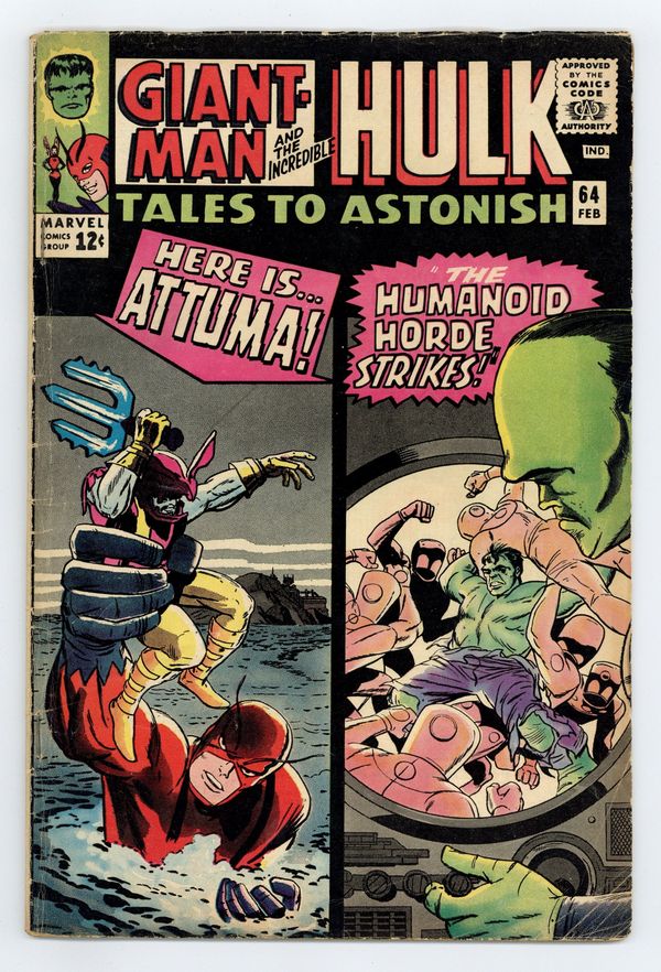 Cover by Jack Kirby and Dick Ayers. When Attuma Strikes!, script by Leon Lazarus, art by Carl Burgos and Paul Reinman; When Hank snaps at Jan for making a clumsy error during an experiment, she tearfully decides to get away from his abuse and take a trip; When her plane is captured in Attuma's latest bid for surface world conquest, a remorseful Giant-Man comes to the rescue. The Horde of Humanoids!, script by Stan Lee, art by Steve Ditko and George Roussos (as George Bell); Banner has been jailed as a traitor and is popping tranquilizers to keep himself from turning into the Hulk; Rick goes right to the commander in chief to tell the prez Banner's secret and to ask for his release; Much to Talbot's chagrin, the president orders Bruce's release and the two are sent to Astra Island to oversee testing of Banner's absorbatron which has the power to soak up a nuclear blast. 36 pgs., full color. $0.12. Cover price $0.12.