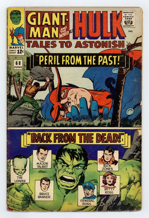 Cover by Jack Kirby, Bob Powell, and Vince Colletta. Peril From the Long-Dead Past!, script by Stan Lee, art by Bob Powell and Vince Colletta; Realizing that the strain of growing and shrinking so much is doing damage to his body, Hank adjusts his helmet so he can only grow to one size--the 35 foot height of Giant-Man; With the Ant-Man side of his abilities out of his bag of tricks, he adjusts Jan's helmet so she can cybernetically communicate with wasps; Oh, and the Human Top attacks too. Back from the Dead!, script by Stan Lee, art by Jack Kirby and Mike Esposito (as Mickey Demeo); Saving Talbot and himself from plunging to their deaths, the Hulk decides he is tired of world travel and leaps home; Waking up in gamma base, Bruce is once again jailed as a traitor and the President once again sets him free (Rick told the commander in chief the secret of the Hulk a few issues ago); Banner and Talbot are once again sent to Astra Island to continue a test of the absorbatron but the leader sends an army of Humanoids who finally succeed in capturing the Hulk. 36 pgs., full color. $0.12. Cover price $0.12.