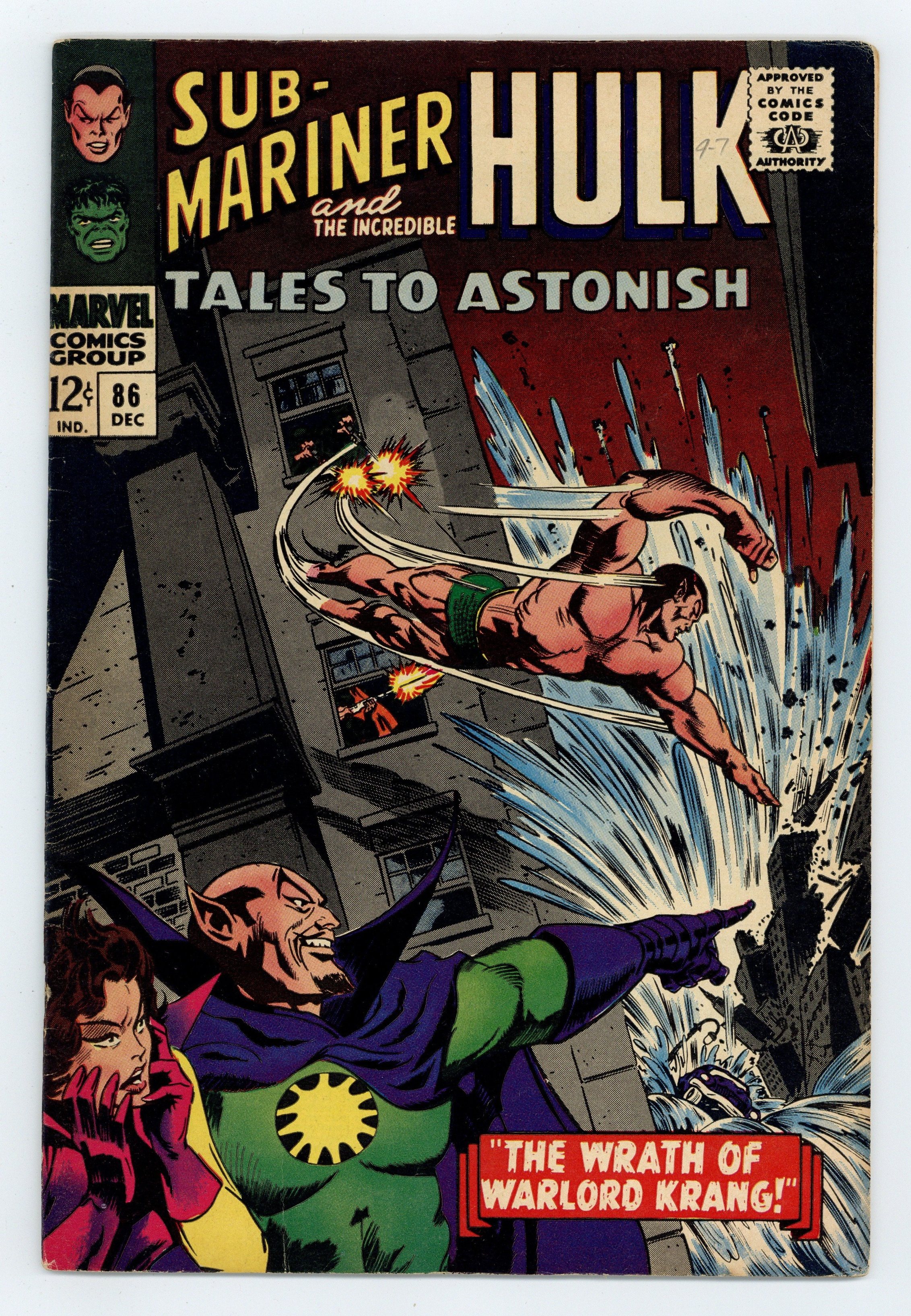 $22.00Cover by Gene Colan and Bill Everett. The Wrath of Warlord Krang!, script by Stan Lee, art by Jerry Grandenetti and Bill Everett; Krang sends a giant tidal wave to devastate New York City and then makes an anonymous tip to the Army to tell them that Namor is the culprit. The Birth...of the Hulk-Killer!, script by Stan Lee, art by John Buscema and Mike Esposito (as Mickey Demeo); Banner is hanging on the Orion missile heading for the heart of New York City and is able to change its course before he transforms to the Hulk once again; Military genius that he is, Ross thinks that it is the Hulk who tried to blow up New York and activates the Leader's most powerful Humanoid robot to take on the jade giant. 36 pgs., full color. $0.12. Cover price $0.12.
