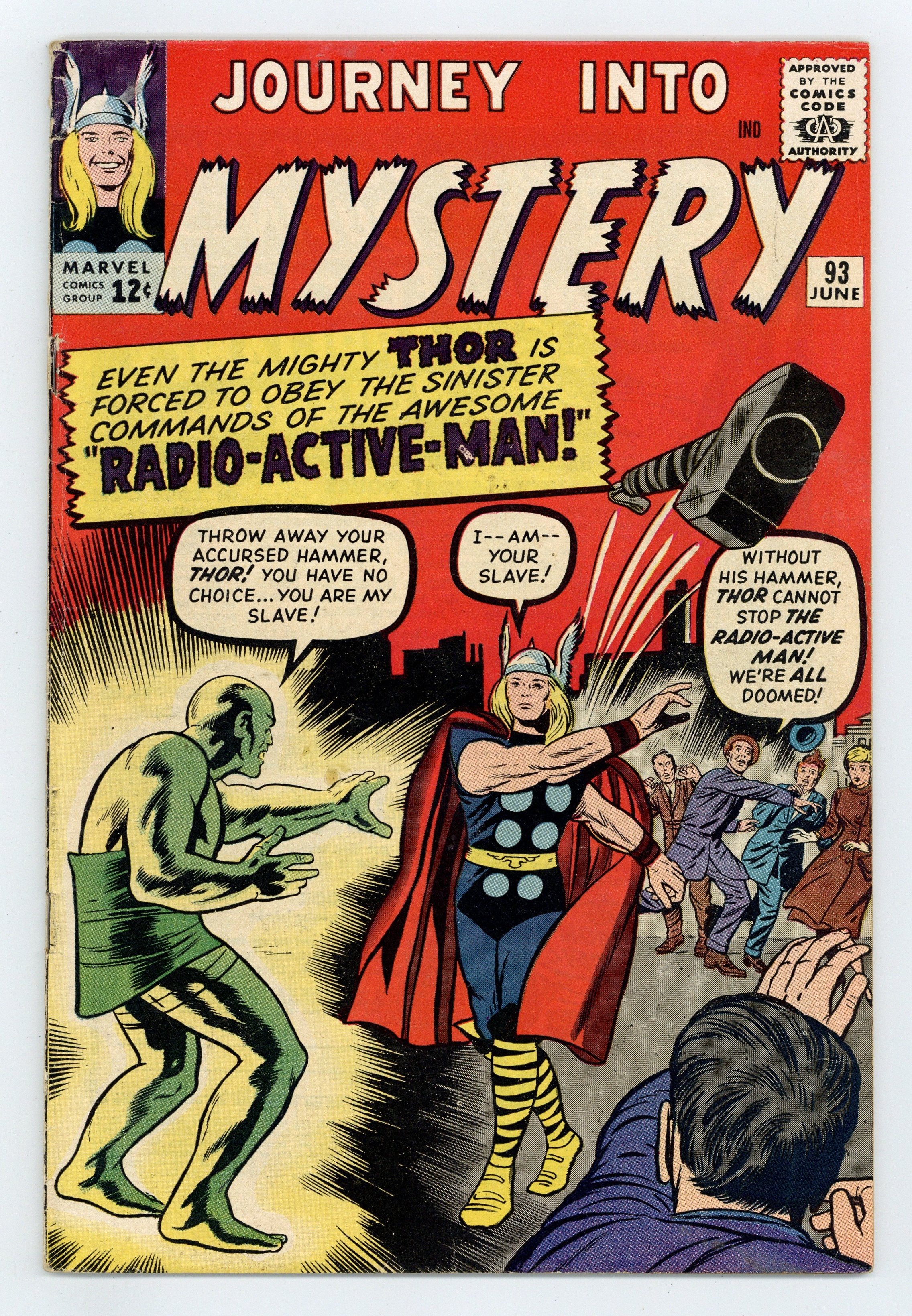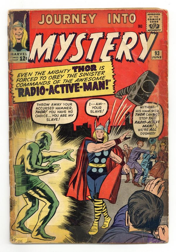 Cover pencils by Jack Kirby, inks by Dick Ayers. "The Mysterious Radio-Active Man!" (first appearance), script by Stan Lee (plot) and Robert Bernstein (script), pencils by Jack Kirby, inks by Dick Ayers; While on a medical mission to India, Dr. Blake becomes Thor to repel a Chinese attack; In order to fight Thor, a Chinese scientist irradiates himself to gain great power. "Over the Moon" two-page text story. "The Man Who Wouldn't Die!", script by Stan Lee (plot) and Larry Lieber (script), pencils by Larry Lieber, inks by Matt Fox; A selfish billionaire builds a fallout shelter deep beneath the Earth's surface, but when he insists on touring it alone he discovers a group of primitive humans that attack him and collapse the tunnel, trapping him. "I Saw a Martian!", script by Stan Lee, art by Steve Ditko; A man cannot convince the police that he saw an alien ship land. 36 pgs., full color. $0.12. Cover price $0.12.