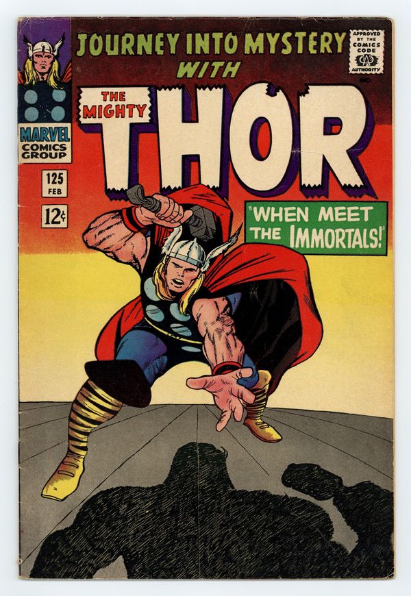 Cover pencils by Jack Kirby, inks by Vince Colletta. "When Meet the Immortals!", script by Stan Lee, pencils by Jack Kirby, inks by Vince Colletta; Thor grapples with "The Demon" to recover the Norn Stone, while Hercules blunders about the world of Man, crossing paths with Jane Foster. Marvel Bullpen Bulletins. Tale of Asgard: "The Queen Commands," script by Stan Lee, pencils by Jack Kirby, inks by Vince Colletta; Thor's plans for a peaceful parlay with the Flying Trolls is dashed when Loki unleashes a poison gas on them! Ad for Hulk Sweat Shirt, Spider-Man Pin-Up, Super-Hero Stationery Kit, and Thor T-Shirt. 36 pgs., full color. $0.12. Cover price $0.12.