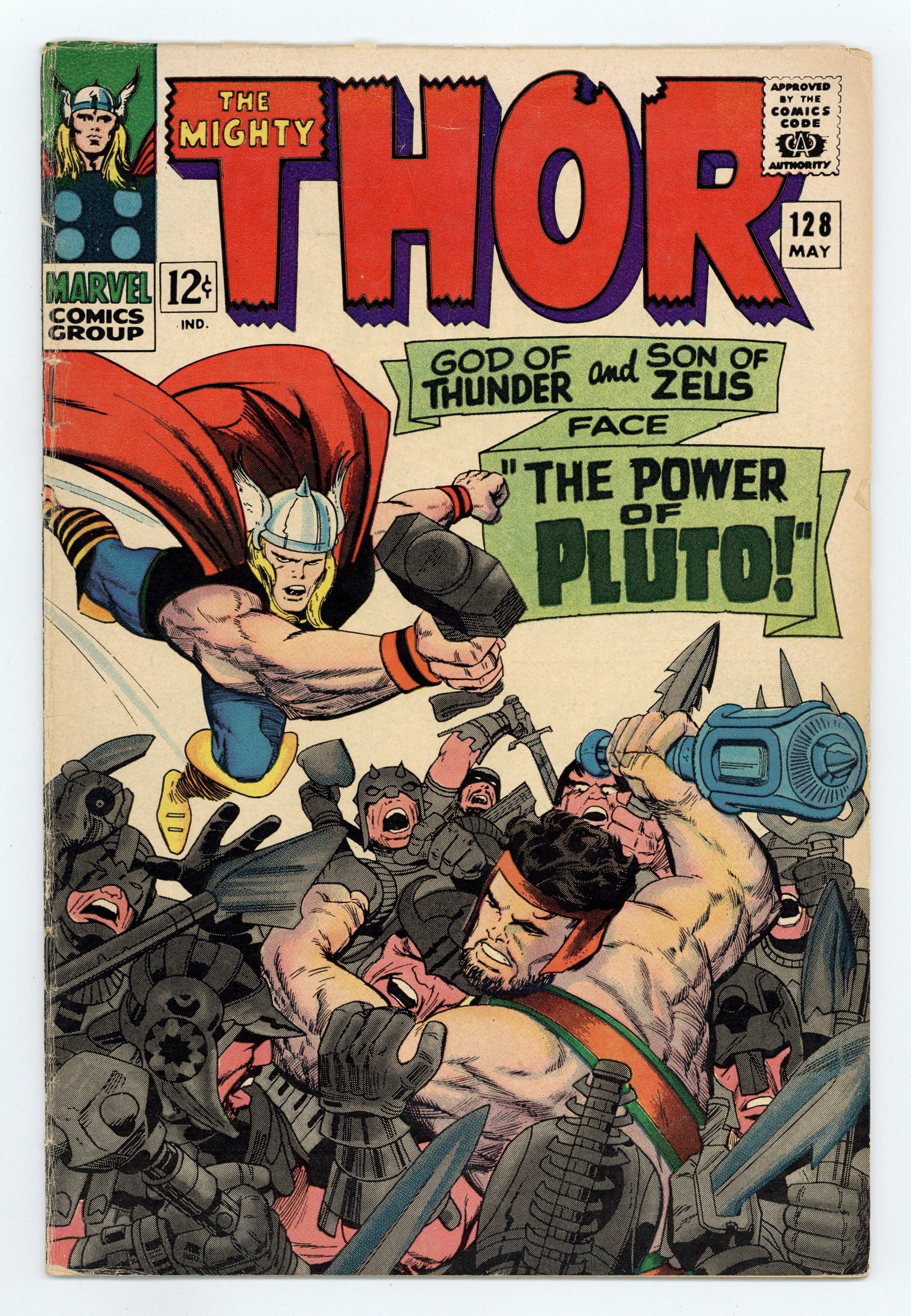 Cover pencils by Jack Kirby, inks by Vince Colletta. "The Power of Pluto!", script by Stan Lee, pencils by Jack Kirby, inks by Vince Colletta; Thor recovers from his injuries last issue and goes looking for a rematch with Hercules who has been tricked into signing a contract with Pluto. Appearances by Odin, Balder, and Volstagg. Tale of Asgard: "Aftermath!", script by Stan Lee, pencils by Jack Kirby, inks by Vince Colletta; The Asgardian gods deliberate over the coming of Ragnarok. Appearance by Odin; cameos by Balder, Hogun, Fandral, and Volstagg. 36 pgs., full color. $0.12. Cover price $0.12.