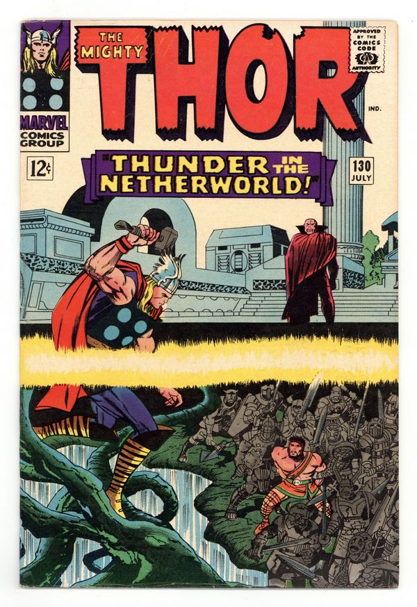 Cover pencils by Jack Kirby, inks by Vince Colletta. "Thunder in the Netherworld!", script by Stan Lee, pencils by Jack Kirby, inks by Vince Colletta; Thor does so much damage to Hades that Pluto gives in and releases Hercules from the contract; Tana sends Jane away wandering. Appearance by Jane Foster. Marvel Bullpen Bulletins. Tale of Asgard: "The Fateful Change!", script by Stan Lee, pencils by Jack Kirby, inks by Vince Colletta; Thor defeats Harokin and discovers they are nearly identical in appearance; The Warriors Three free Asgard's defenders from Harokin's dungeons. Ad for Thing Sweat Shirt and Hulk Sweat Shirt. Ad for Marvel Comics Group Official Swingin' Stationery, Thor T-Shirt, and Spider-Man Poster. The M.M.M.S. Still Wants You! ad. 36 pgs., full color. $0.12. Cover price $0.12.