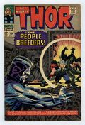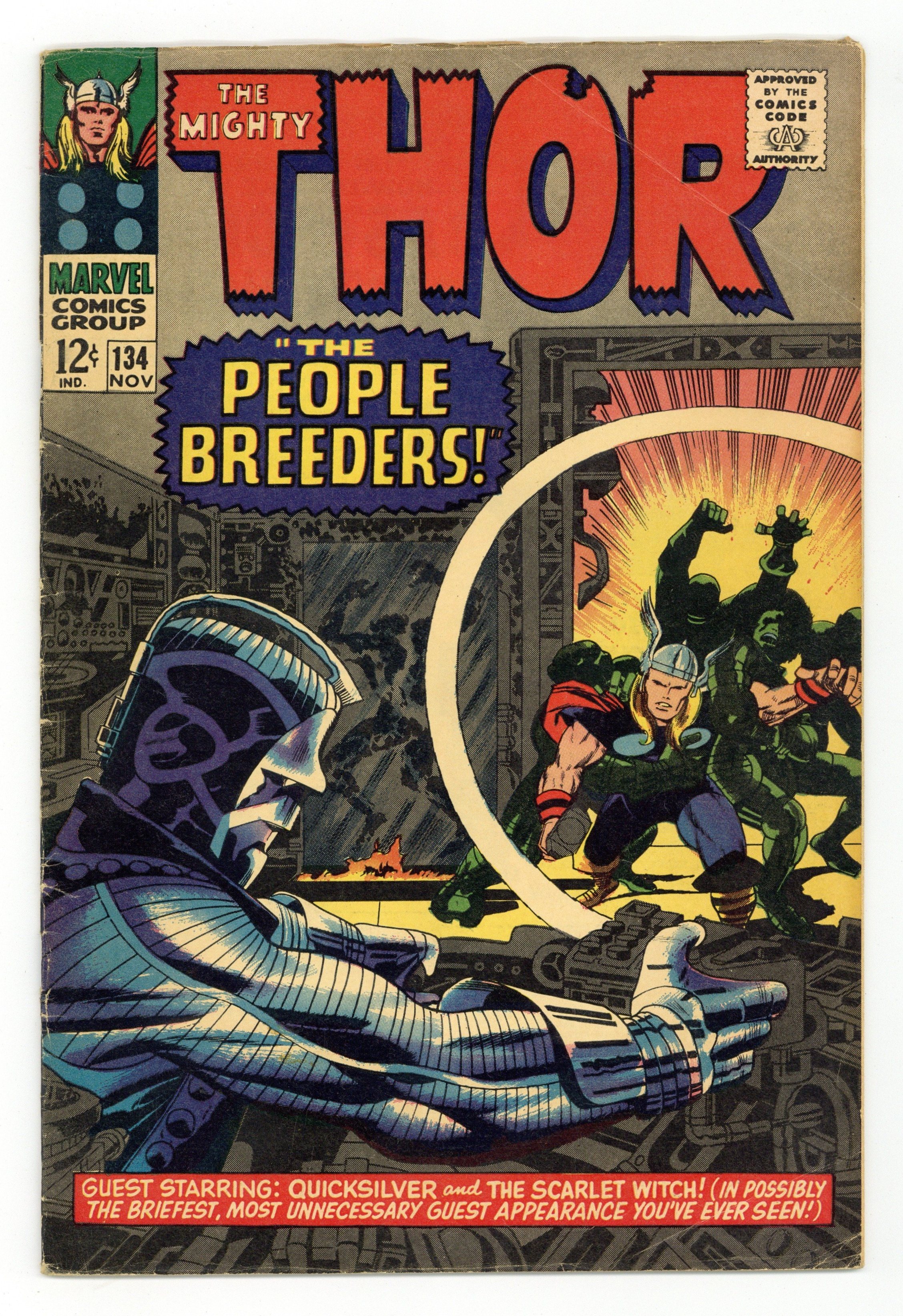 Tags: Marvel Legacy Numbering: Thor (part 134), Thor$45.00Cover pencils by Jack Kirby, inks by Vince Colletta. First appearances by the High Evolutionary and the Man-Beast in "The People-Breeders!", script by Stan Lee, pencils by Jack Kirby, inks by Vince Colletta; Appearances by Quicksilver, the Scarlet Witch, the Recorder, and Jane Foster; Galactus cameo. Tale of Asgard: "When Speaks the Dragon!", script by Stan Lee, pencils by Jack Kirby, inks by Vince Colletta; Thor and companions inspect Nastrond for Odin. Volstagg wanders off and finds Fafnir. Marvel Super-Heroes Are On TV! ad. 36 pgs., full color. $0.12. Cover price $0.12.