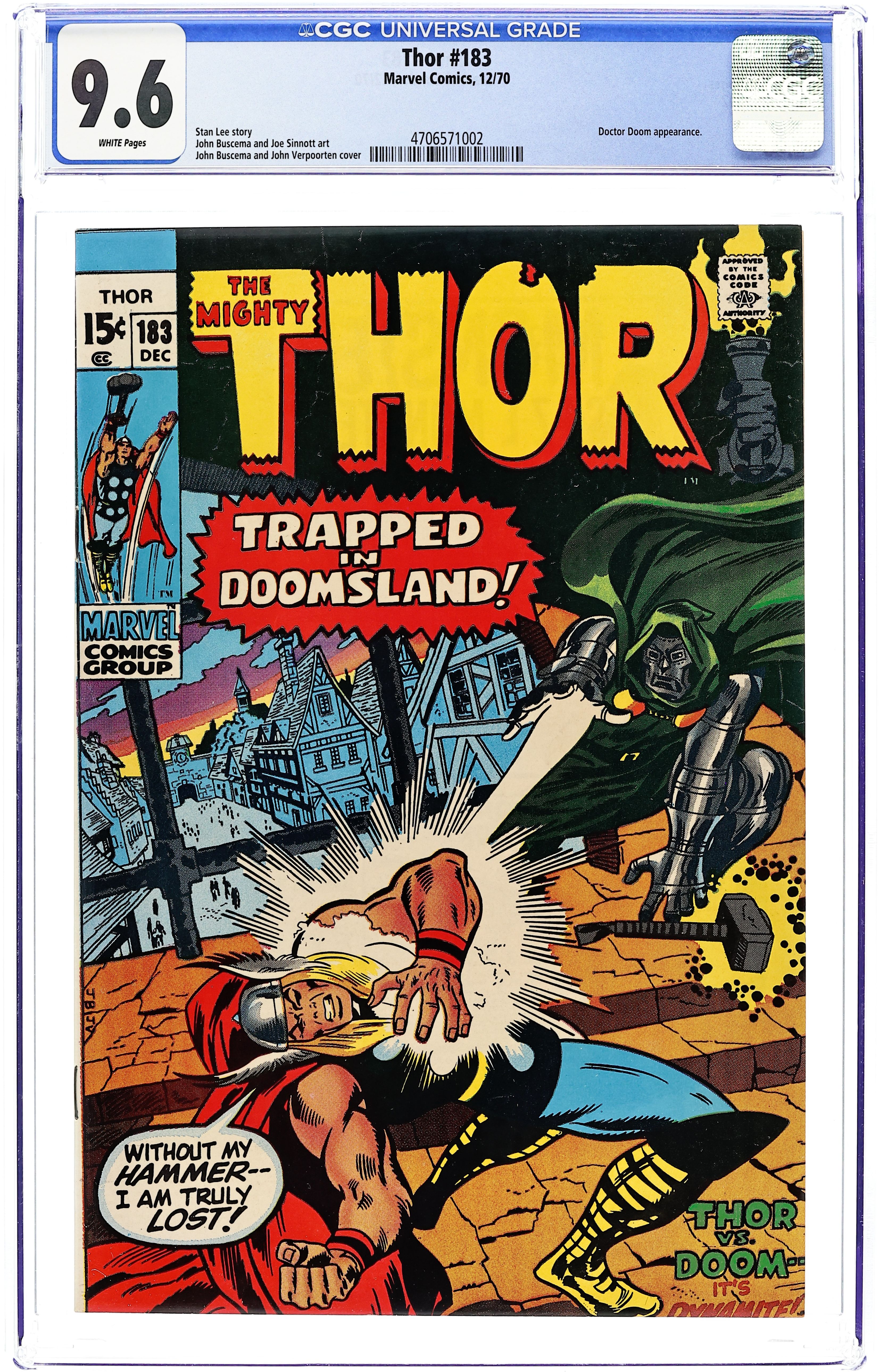 Cover pencils by John Buscema, inks by John Verpoorten. "Trapped in Doomsland," script by Stan Lee, pencils by John Buscema, inks by Joe Sinnott; Thor is in Latveria with a missile on his tail that threatens to not only destroy him, but a village full of innocent people below him as well; However, Thor comes up with a solution: Using his hammer to create a vortex, Thor throws it high into the sky, causing it to suck the missile out of harms way; However, without his hammer, Thor slams into the ground and watches as the missile explodes harmlessly; When his hammer doesn't come back, Thor must find it, but the 60 second limit he can spend away from his hammer elapses and he changes back into Donald Blake; Meanwhile, Dr. Doom has tracked the location of Thor's hammer. Bullpen Bulletins. 36 pgs., full color. $0.15. Cover price $0.15.