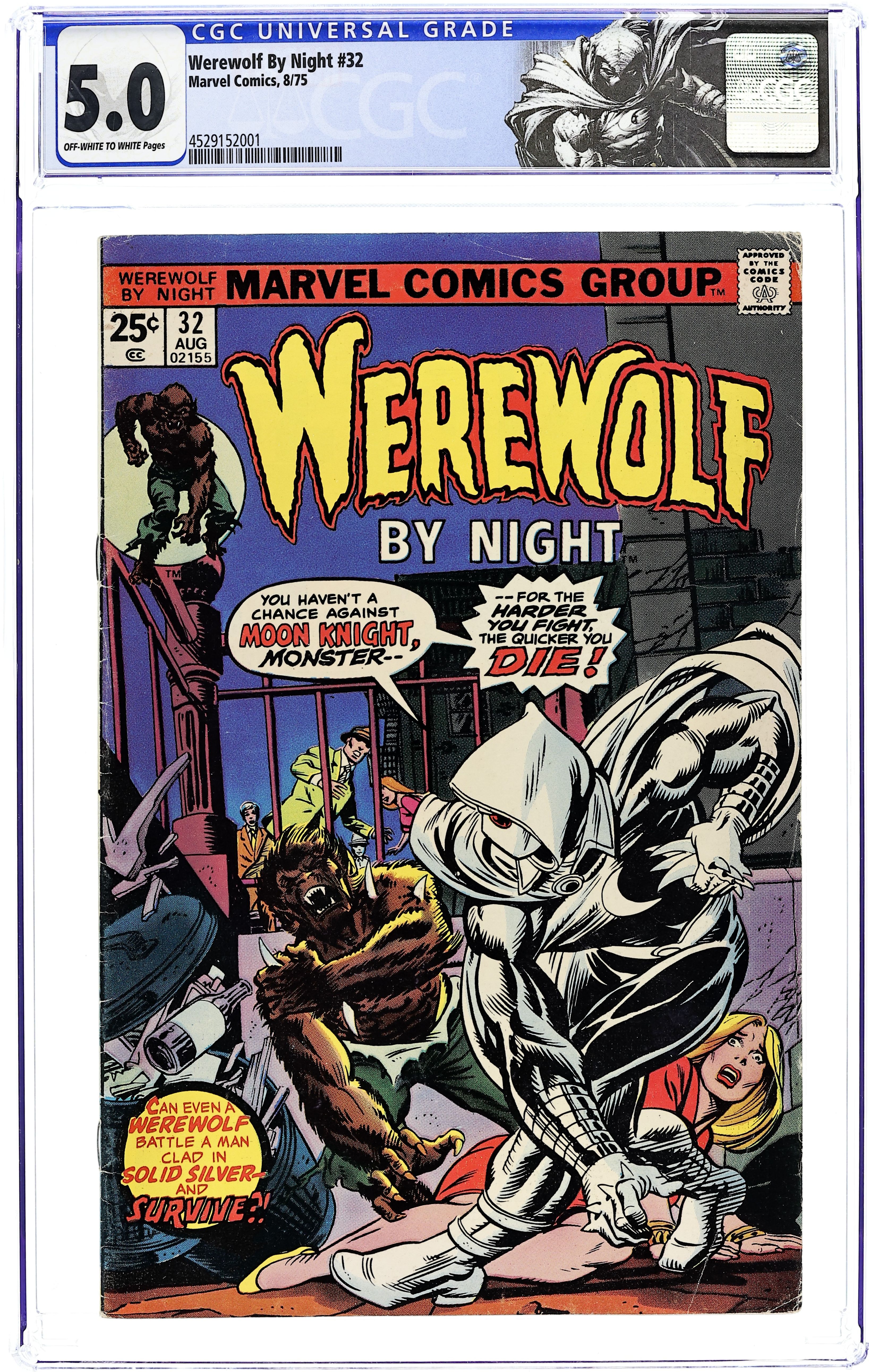 "The stalker called Moon Knight!" Written by Doug Moench. Art by Don Perlin. Cover by Gil Kane. Just as Jack Russell plunges into the horror of killing his best friend, the second night strikes and with it comes the stalker called MOON KNIGHT! 32 pages, FC. NOTE: 1st appearance of Moon Knight. Cover price $0.25.