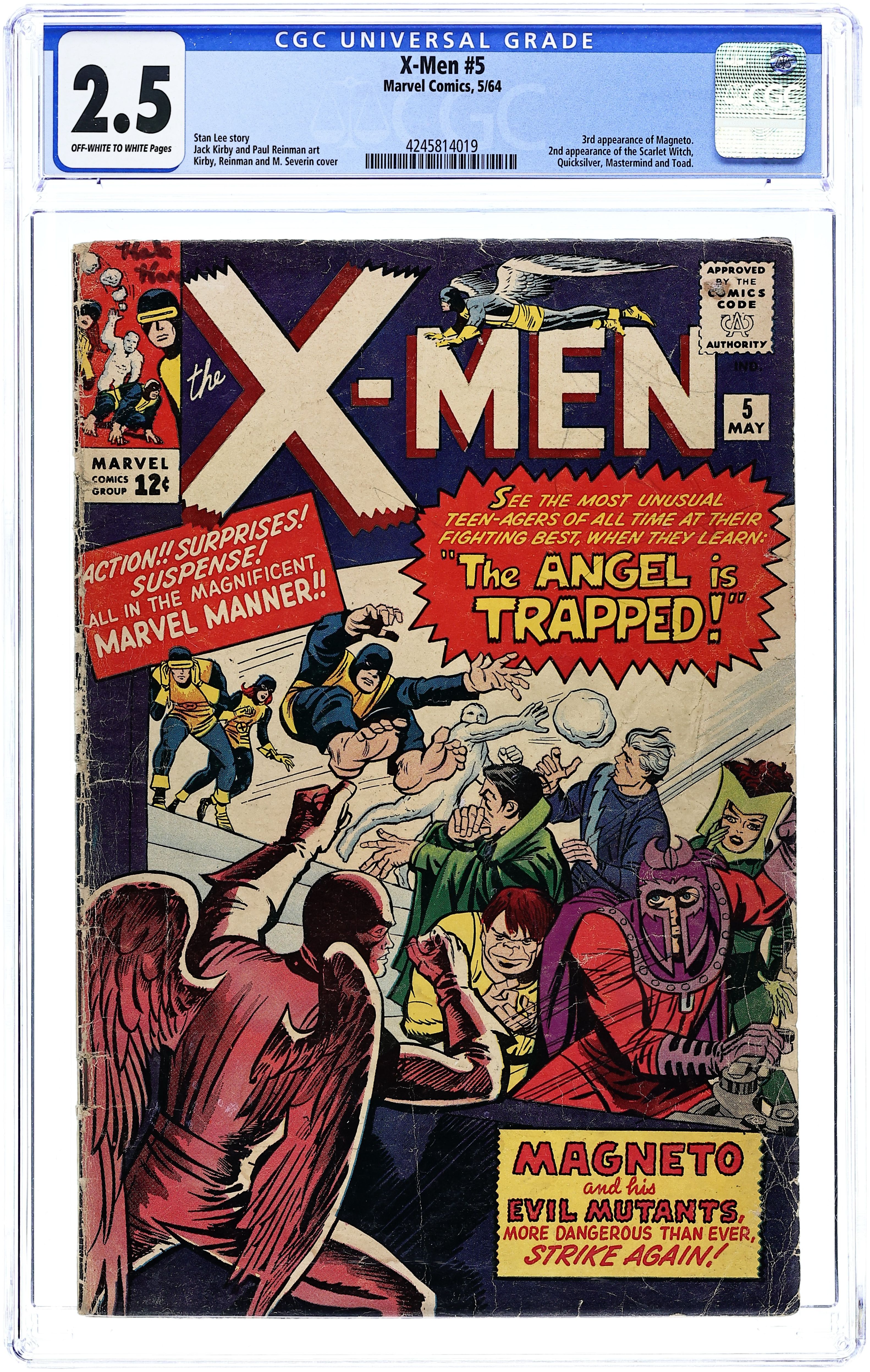 Cover pencils by Jack Kirby, inks by Paul Reinman and Marie Severin (Angel alterations). Trapped: One X-Man!, script by Stan Lee, pencils by Jack Kirby, inks by Paul Reinman; With Xavier's mental powers gone, the X-Men try to decide how they will function without his leadership; Trying to ferret out the X-Men, Magneto has the Toad enter an atheletic event where he leaps to victory; With the crowd turning hostile due to the Toads amazing abilities, the X-Men arrive on the scene to capture him; Magneto snags Angel and whisks him away to Asteroid M; In an attempt to trade the Toad for Angel, the X-Men arrive on Asteroid M where they battle the Brotherhood once again; On their safe return to earth, Xavier revels that his power loss was a ruse to test his students. First Appearance of Magneto's Asteroid M; Prof's loss of powers just a test. Letter column begins in this issue. 36 pgs. $0.12. Cover price $0.12.