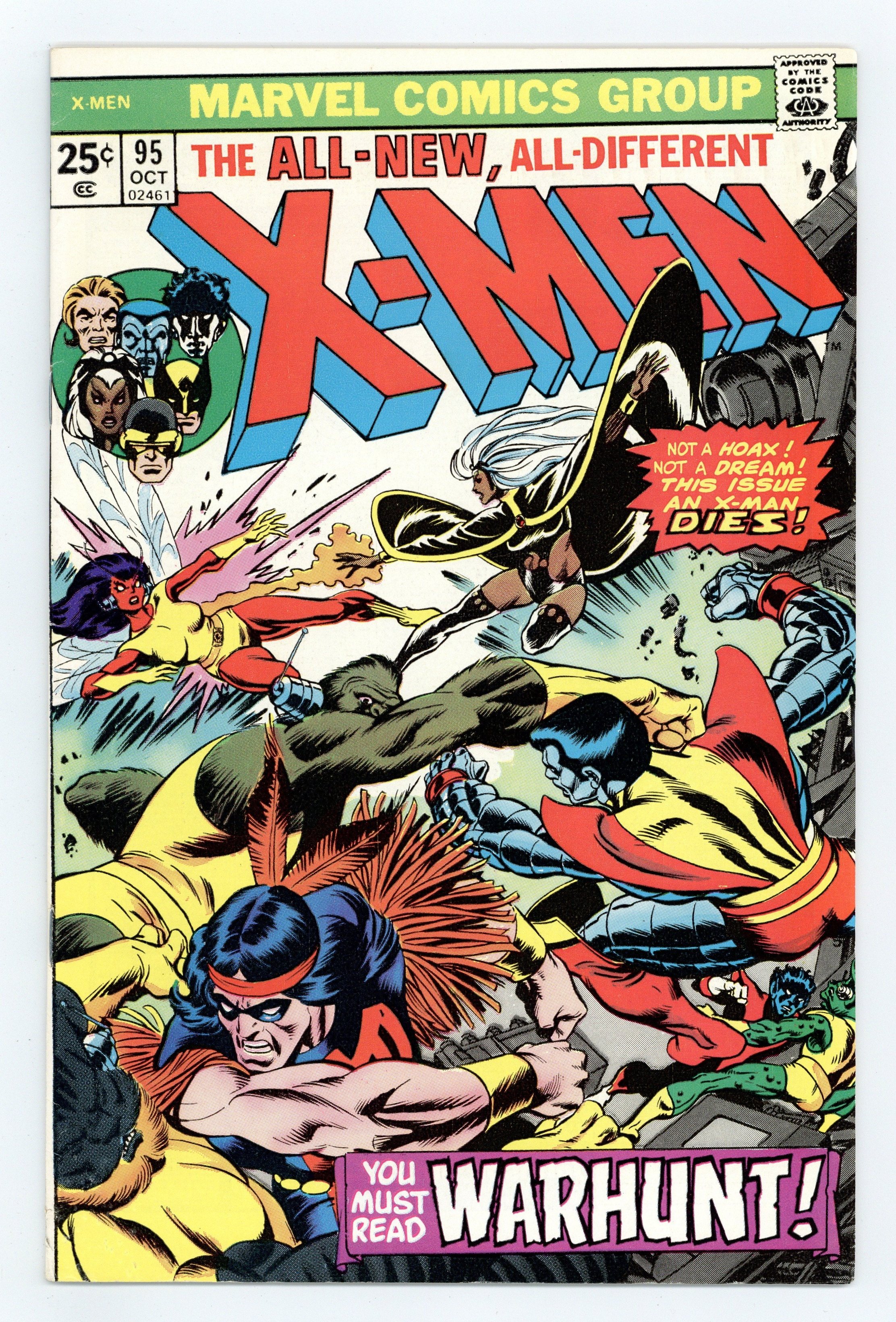 "Warhunt!" Part 2 of 2. Story by Chris Claremont and Len Wein. Art by Dave Cockrum and Sam Grainger. Cover by Gil Kane. In order to stop the sinister madman Count Nefaria from raining nuclear Armageddon down upon the world, the new X-Men must fight their way through the Count's mutated bodyguards - the Ani-Men! Plus, one X-Man makes the ultimate sacrifice! NOTE: Death of Thunderbird I. 36 pgs. Cover price $0.25.