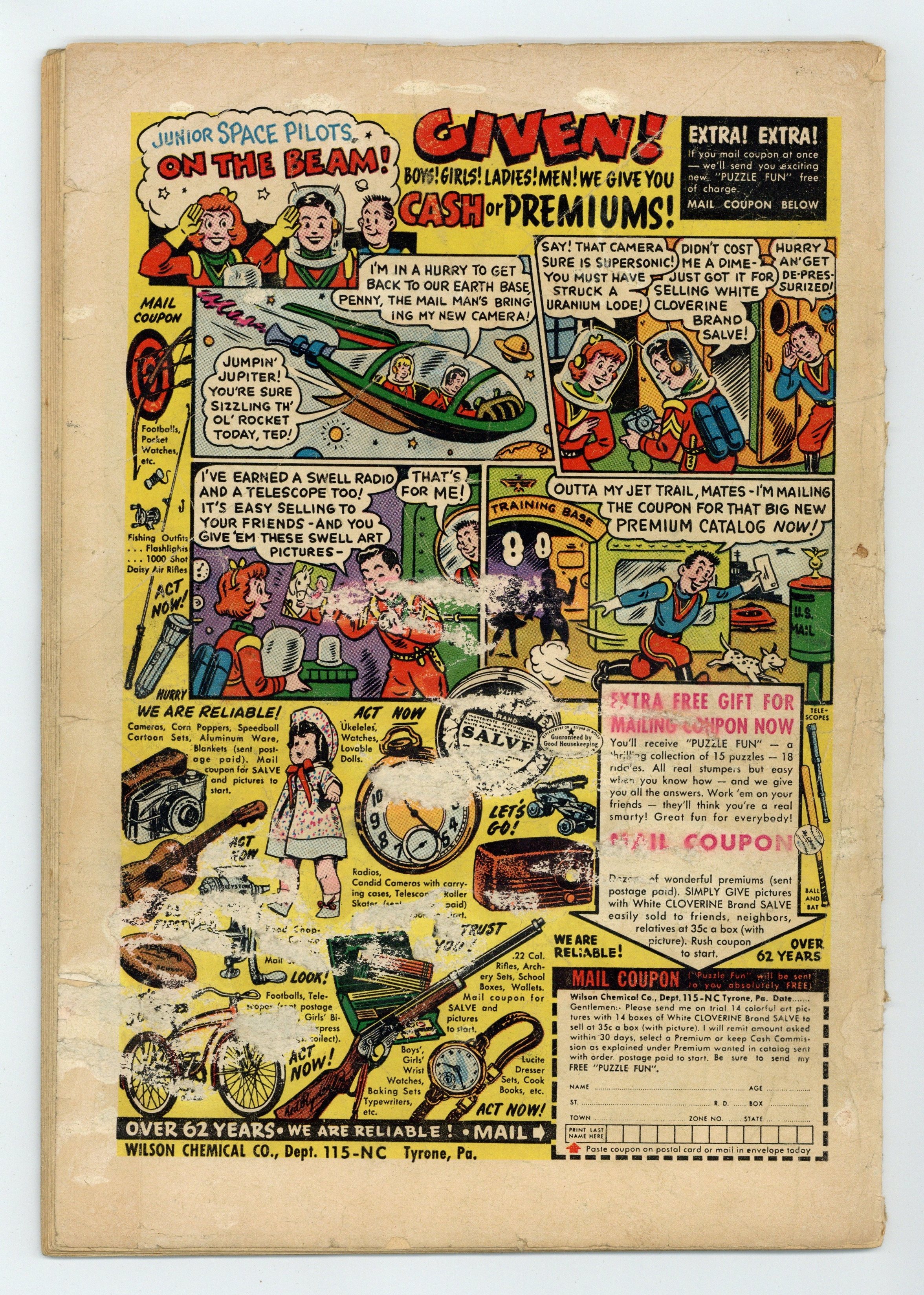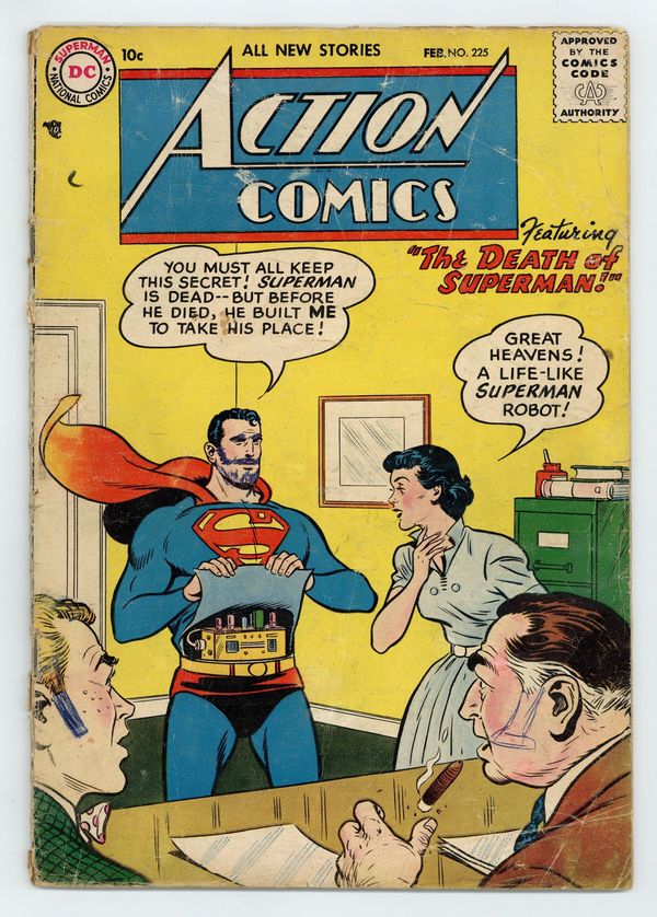 Cover by Al Plastino. "The Death of Superman," pencils by Wayne Boring, inks by Stan Kaye; A Superman robot comes to the Daily Planet and reveals to Perry White, Lois Lane, and Jimmy Olsen that the real Superman is dead. "The Doomed Safaris!" starring Congo Bill, art by Howard Sherman. -page Varsity Vic story by Henry Boltinoff. I Jumped 3 1/2 Miles And Lived article. "The Interplanetary Fort Knox," script by Otto Binder, art by Jim Mooney; Tommy Tomorrow vs. Orion Orton. 36 Pages, Full Color. $.10 Cover price $0.10.