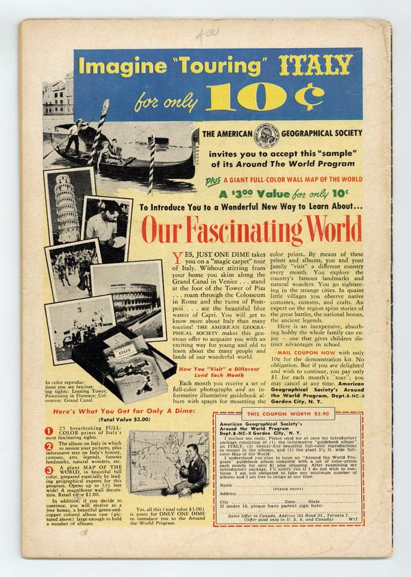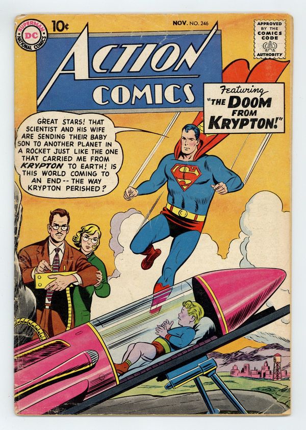 Cover pencils by Curt Swan, inks by Stan Kaye. "Krypton on Earth!", pencils by Wayne Boring, inks by Stan Kaye; Real estate promoter Jonas Smith creates the planned community of Krypton Island, which opens with a pageant featuring a re-enactment of Jor-El and Lara sending Baby Kal-El to Earth; But Superman realizes Smith is a wanted criminal and stops him from smuggling off Krypton Island diamonds that Superman made from coal. "The King of Cages" starring Congo Bill, script by Jack Miller, art by Howard Sherman. "Destination Unknown" starring Tommy Tomorrow, script by Otto Binder, art by Jim Mooney. 36 Pages, Full Color. $.10 Cover price $0.10.