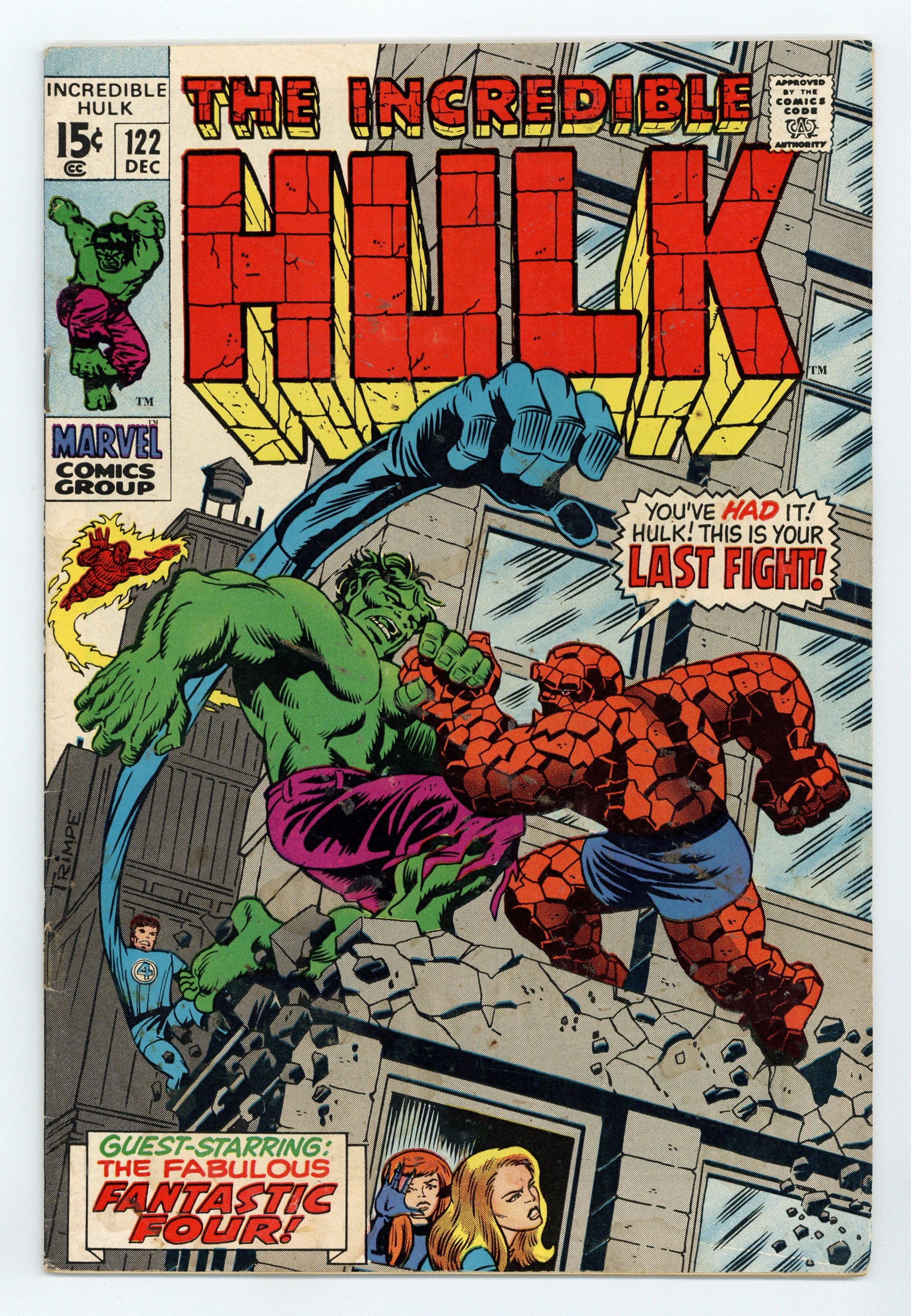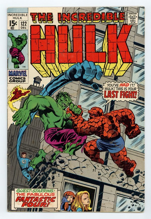 Starts Apr 20 Cover art by Herb Trimpe. The Hulk's Last Fight!, script by Roy Thomas, art by Herb Trimpe; Despairing after he turns into his human alter ego and finds that the Hulk has destroyed a train for no apparent reason, Bruce Banner finds a newspaper headline that asks him to come to New York as Mr. Fantastic believes that he has discovered a way to do away with the Hulk for good; Riding the rails to the Big Apple, Bruce tries to jot some notes of his own regarding Reed's process and secures them to his waist as he finds himself transforming once again into the Hulk to face down some pesky hoboes; By the time he makes it to the Baxter Building, our hero is once again in the form of Bruce Banner but an irate security guard makes his metabolism race and he changes into his monstrous alter ego; During Hulk's battle with the F.F., Sue notices as the pouch with Bruce's notes falls from the Hulk's waist and the Thing is called on to keep the jade giant occupied while Reed uses the new information to modify his weapon design in trying to banish the Hulk for good. 36 pgs. $0.15. Cover price $0.15.