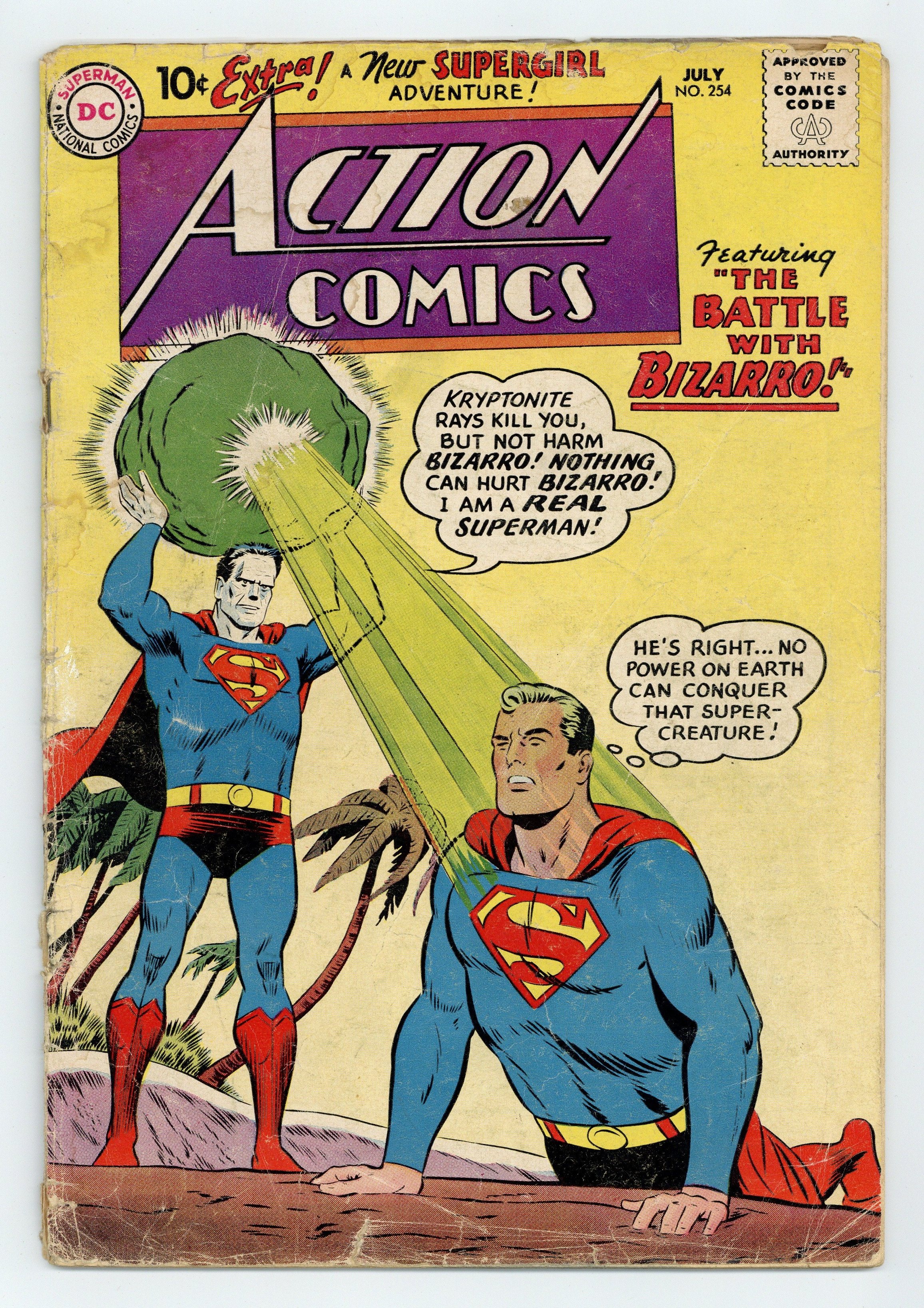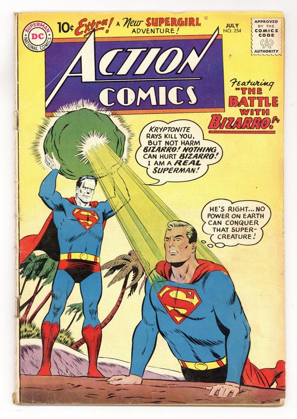 Cover pencils by Curt Swan, inks by Stan Kaye. 1st meeting of Bizarro and Superman (cover & story) in "The Battle with Bizarro!", script by Otto Binder, art by Al Plastino; Luthor steals Professor Dalton's duplicating machine and creates an adult Bizarro to menace Superman, but this Bizarro turns on its creator, hands him over to the authorities, and attempts to help Superman; When the people he has helped react in horror to him, Bizarro gets depressed. 2/3-page Ollie story by Henry Boltinoff. "Congorilla Goes Wild!", art by Howard Sherman; A thief steals Congo Bill's ring and uses it to switch minds with Congorilla. "Supergirl's Foster Parents!", script by Otto Binder, art by Jim Mooney; Supergirl is adopted by a couple that turn out to be snake-oil salesmen. 36 Pages, Full Color. $.10 Cover price $0.10.