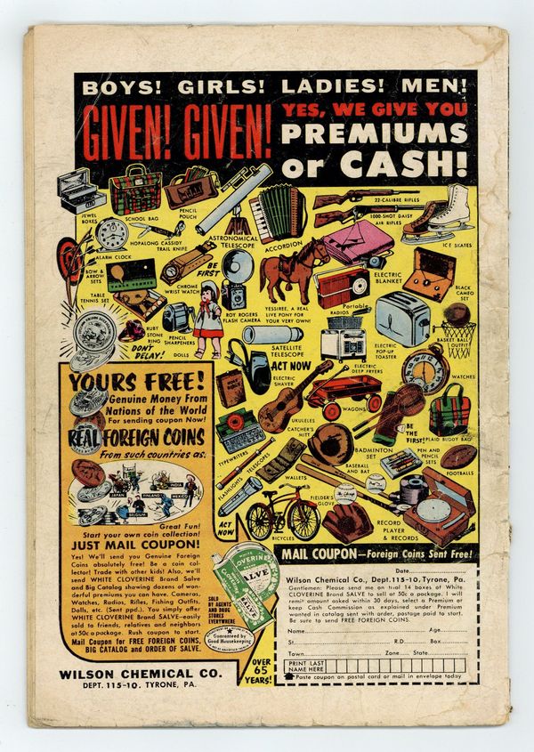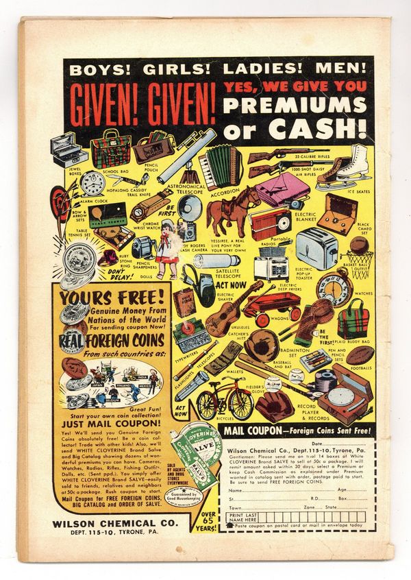 Ends Apr 13 7:05 PM CST Bid History 5 bids Current Bid $8 Your Secret Max Bid If you'd like to bid, please log in or register. Cover pencils by Curt Swan, inks by Stan Kaye. 1st meeting of Bizarro and Superman (cover & story) in "The Battle with Bizarro!", script by Otto Binder, art by Al Plastino; Luthor steals Professor Dalton's duplicating machine and creates an adult Bizarro to menace Superman, but this Bizarro turns on its creator, hands him over to the authorities, and attempts to help Superman; When the people he has helped react in horror to him, Bizarro gets depressed. 2/3-page Ollie story by Henry Boltinoff. "Congorilla Goes Wild!", art by Howard Sherman; A thief steals Congo Bill's ring and uses it to switch minds with Congorilla. "Supergirl's Foster Parents!", script by Otto Binder, art by Jim Mooney; Supergirl is adopted by a couple that turn out to be snake-oil salesmen. 36 Pages, Full Color. $.10 Cover price $0.10.