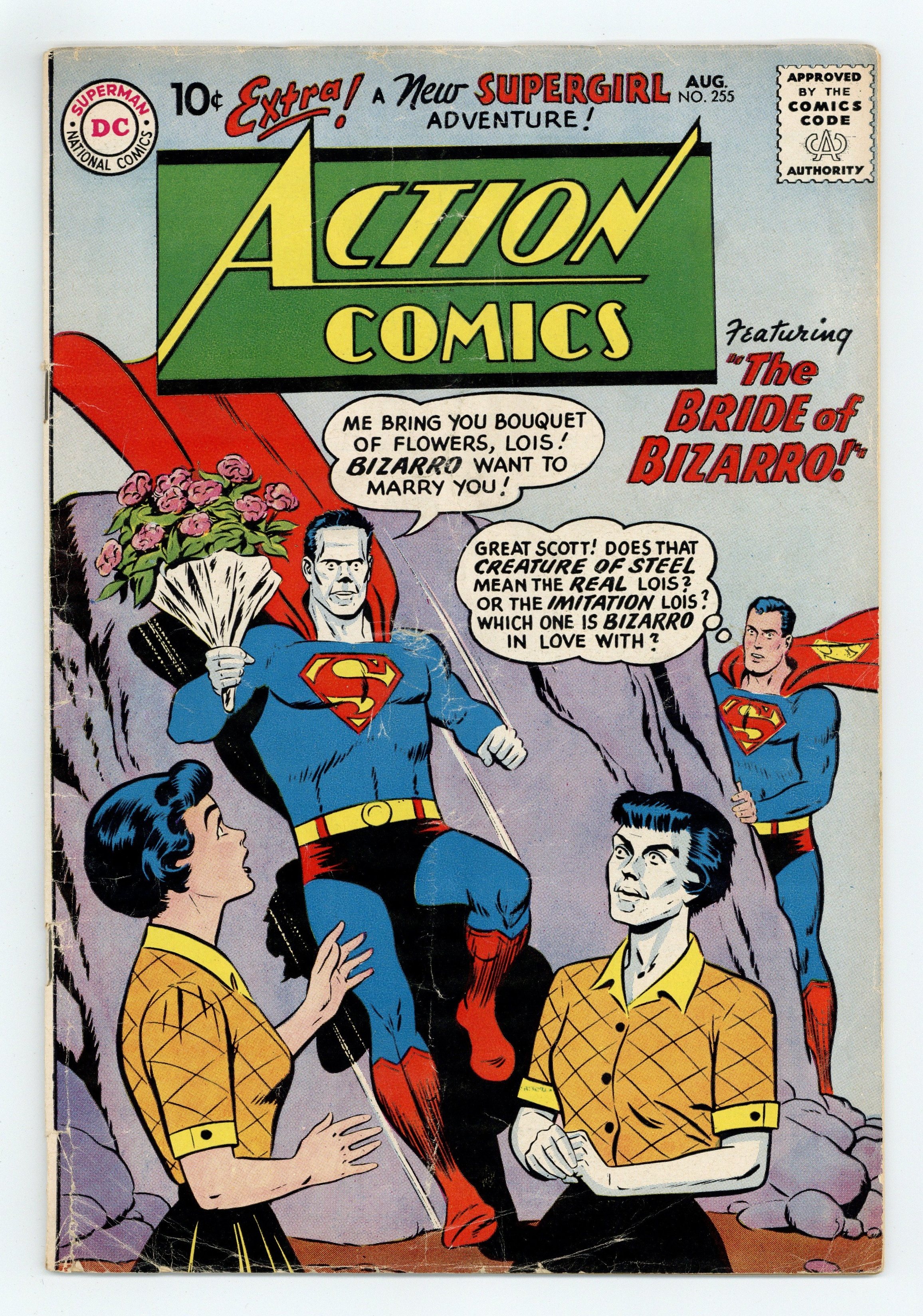 Starts Jul 4 Cover pencils by Curt Swan, inks by Stan Kaye. 1st appearance of Bizarro Lois Lane (cover & story) in "The Bride of Bizarro!", script by Otto Binder, art by Al Plastino; Bizarro keeps the real Superman from revealing to Lois that she has been proposed to by Bizarro's duplicate, whom he calls New Bizarro, with a kryptonite meteorite, but Lois realizes New Bizarro is not the true Man of Steel; The New Bizarro doesn't give up easily, and the duplicates fight each other. "The Abominable Snowman!", script by Robert Bernstein, art by Howard Sherman; Congo Bill vs. The Abominable Snowman. Half-page Jerry the Jitterbug story by Henry Boltinoff. "Supergirl Visits the 21st Century!", script by Otto Binder, art by Jim Mooney; Supergirl takes her first flight across the time-barrier from 1959 into the future, about a hundred years; hence, she secretly observes a brilliant young orphan named Tommy on an asteroid orphanage. 36 Pages, Full Color. Cover price $0.10.