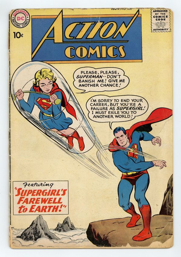 Cover pencils by Curt Swan, inks by Stan Kaye. "The Menace of the Cosmic Man," script by Bill Finger, pencils by Wayne Boring, inks by Stan Kaye; General Malvio creates a robot superhero so that he can use him to assassinate the President of Borkia. One-page Tricksy story by Henry Boltinoff. "Congorilla Goes to War," script by Robert Bernstein, art by Howard Sherman; Congorilla protects a daffy ex-Foreign Legion officer who thinks his pets are still his troops. "Supergirl's Farewell to Earth!", script by Otto Binder, art by Jim Mooney; Superman punishes Supergirl for revealing her existence to Krypto; But Supergirl discovers a secret about Superman all by herself. 36 Pages, Full Color. $.10 Cover price $0.10.