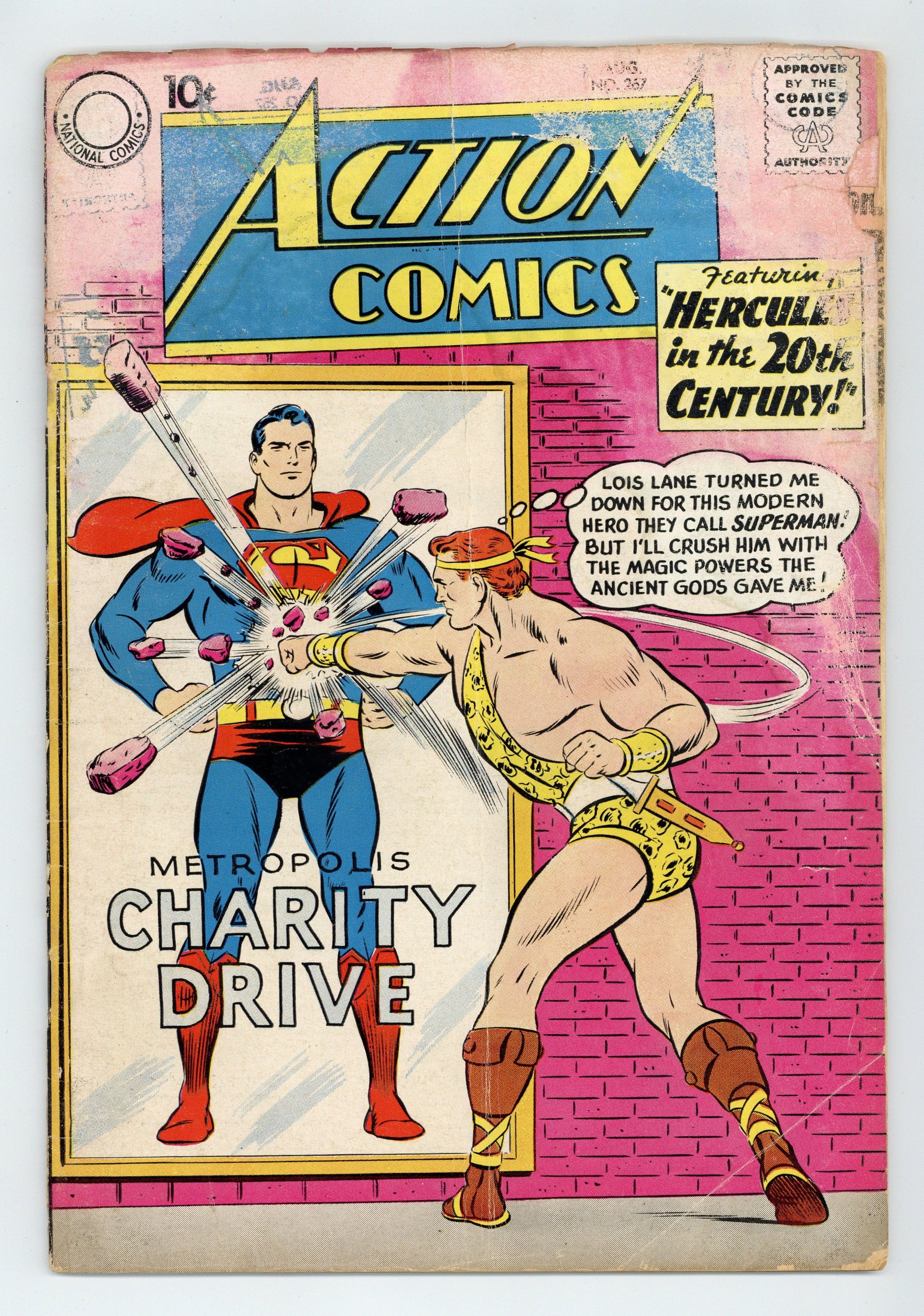 Starts Apr 20 Cover pencils by Curt Swan, inks by Stan Kaye. "Hercules in the 20th Century!", script by Otto Binder, pencils by Wayne Boring, inks by Stan Kaye; Lex Luthor builds a time-machine to bring Hercules to the present to use him to stop Superman; Hercules gets wise to Luthor's plan and helps Superman stop Luthor and then decides to stay in the present and falls in love with Lois Lane. 3rd appearance of Legion of Super-Heroes, 1st appearance of Chameleon Boy, Colossal Boy, and Invisible Kid in the Supergirl story "The Three Super-Heroes!", script by Jerry Siegel, art by Jim Mooney; The Legion comes to the 20th century to meet Supergirl and invites her to come to the 30th Century to apply to join the Legion. One-page Ollie story by Henry Boltinoff. 36 Pages, Full Color. $.10 Cover price $0.10.