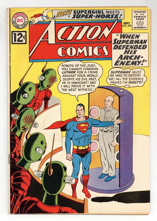 Cover pencils by Curt Swan, inks by George Klein. "When Superman Defended His Arch-Enemy!", art by Al Plastino; Superman travels to the planet Roxar where he is forced to defend Lex Luthor in a trial on a murder charge. One-page Homer story by Henry Boltinoff. 2nd appearance of Comet the Superhorse (see Adventure # 293 for 1st appearance) in "The Super-Steed of Steel!", script by Leo Dorfman, art by Jim Mooney; Supergirl encounters Comet for the first time. 36 Pages, Full Color. $0.12 Cover price $0.12.