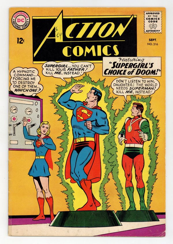 Cover pencils by Curt Swan, inks by George Klein. "Zigi and Zagi's Trap for Superman!", script by Leo Dorfman, art by Jim Mooney; When Zigi and Zagi leave Earth for their own world the escaped convict "Slash" Sabre stows away on their ship; Superman follows them to retrieve Sabre. Supergirl's Boy Friends article. "Supergirl's Choice of Doom!", script by Leo Dorfman, art by Jim Mooney; Supergirl is shown a vision of the future that will force her to decide to kill either Superman or her own father; However, Zor-El and Allura faked the prediction so that they have an excuse to return to Kandor and can restore the Danverses to Earth. 36 Pages, Full Color. $0.12 Cover price $0.12.