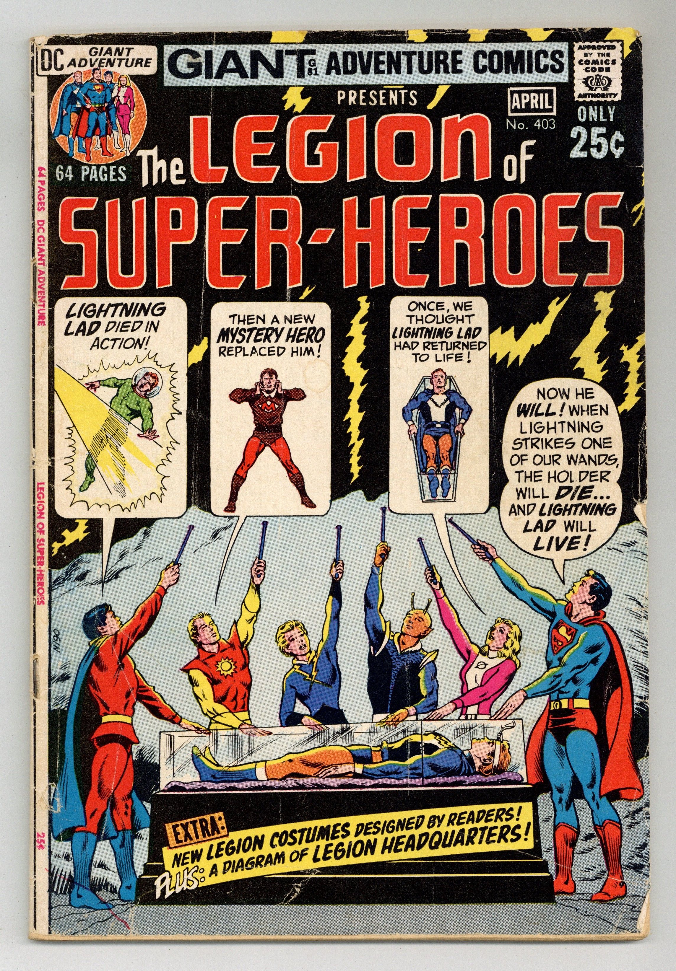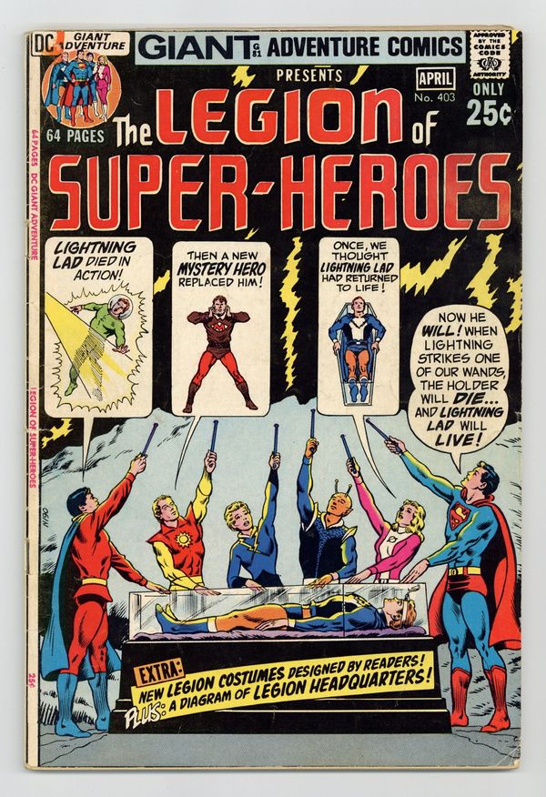 68-page Giant G-81; Legion of Super-Heroes reprints. Cover pencils by Curt Swan, inks by Murphy Anderson. The Stolen Super-Powers! (from Adventure 304), script by Jerry Siegel, art by John Forte; Saturn Girl tries to sacrifice herself as the Legionnaire predicted to die fighting Zaryan, but Lightning Lad dies instead. The Secret of the Mystery Legionnaire (from issue 305), script by Jerry Siegel, art by John Forte; Mon-El finally leaves the Phantom Zone and joins the Legion full-time. The Return of Lightning Lad! (from issue 308), script by Edmond Hamilton, art by John Forte. Part I: The Super Sacrifice of the Legionnaires! (from issue 312), script by Edmond Hamilton, art by John Forte. Part II: The Bravest Legionnaire! Special new features: Fashions from Fans presents alternate costumes suggested by fans (pencils by Ross Andru, inks by Mike Esposito) and a two-page Diagram of Legion Headquarters Complex. 68 Pages, Full Color. Cover price $0.25.