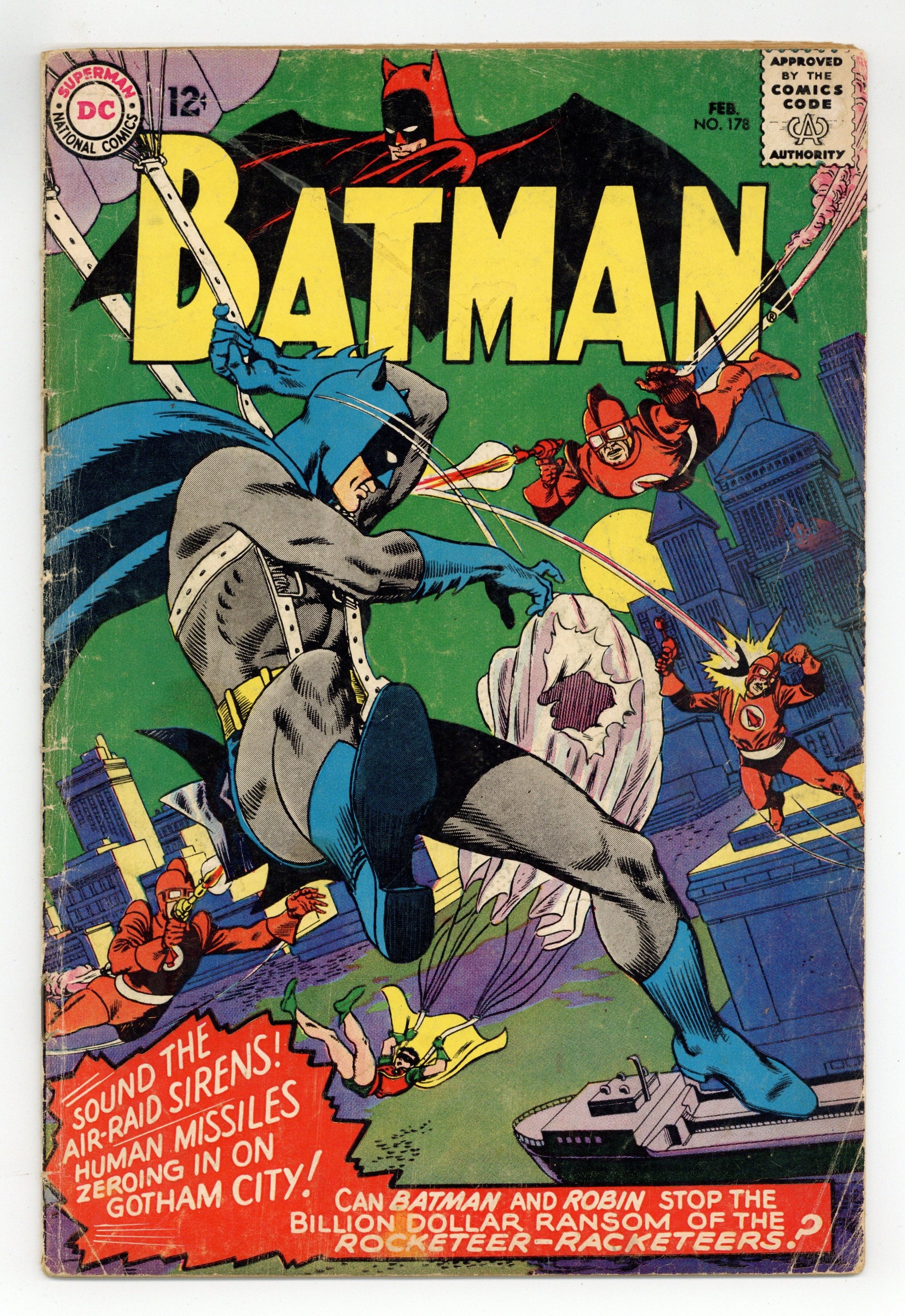 $37.50Cover pencils by Gil Kane, inks by Murphy Anderson. "Raid of the Rocketeers!", script by Robert Kanigher, pencils by Sheldon Moldoff (as Bob Kane), inks by Joe Giella; When two experimental missiles disappear after being launched, the Caped Crusaders follow the path of the third missile and discover that it has been intercepted by a strange beam, set in motion by jet-propelled crooks! Fingerprint Oddities! article. The Invisible Handicap! public service announcement, art by Sheldon Moldoff. Cap's Hobby Center activity half-page by Henry Boltinoff. "The Loan Shark's Hidden Hoard!", script by John Broome, pencils by Sheldon Moldoff (as Bob Kane), inks by Sid Greene; When Rosy and Weeper borrow money from a loan shark to bet on a race, and promptly end up losing; They fear that Sharkey will kill them so the Dynamic Duo step in before that can happen. One-page Warden Willis story by Henry Boltinoff. 36 Pages, Full Color. Cover price $0.12.