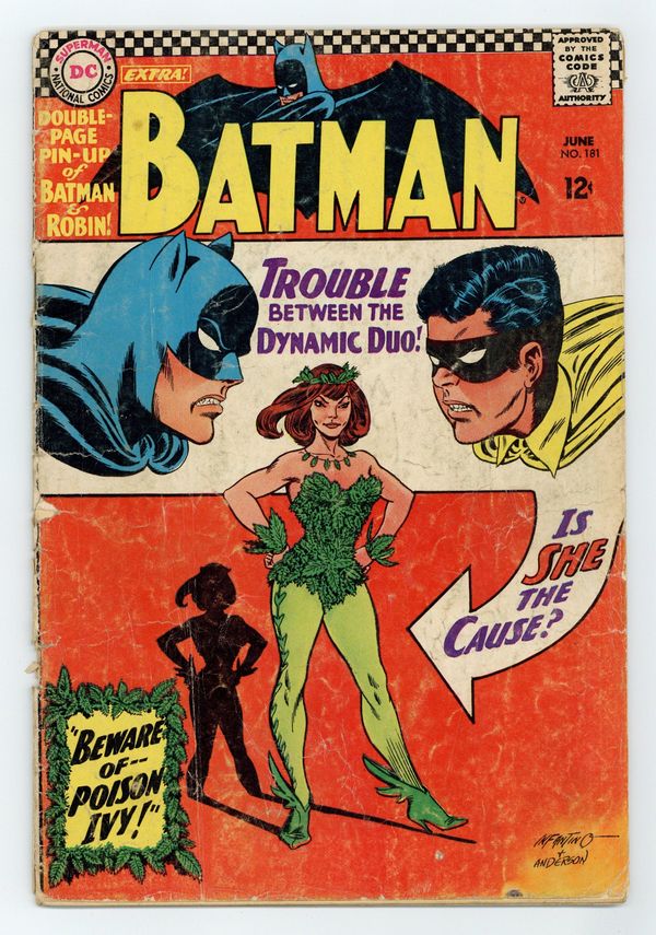 The 1st appearance of Poison Ivy. Cover pencils by Carmine Infantino, inks by Murphy Anderson. "Beware of--Poison Ivy!", script by Robert Kanigher, pencils by Sheldon Moldoff (as Bob Kane), inks by Joe Giella; While Bruce and Dick are attending an art show, a woman shows up, claiming to be the greatest criminal of those currently residing in Gotham. Centerspread is a great two-page color poster of Batman and Robin, pencils by Carmine Infantino, inks by Murphy Anderson. "The Perfect Crime--Slightly Imperfect!", script by Gardner Fox, inks by Sid Greene; At the latest meeting of the Anaylists, Kaye announces that she didn't write her latest book, and seems to be threatened by a voice from her brooch; Batman has a feeling that the Kaye at the meeting is an imposter, so he looks into the matter. Letter from future comics writer Mike Friedrich. Rocky and Bullwinkle star in a one-page Cheerios ad. 36 Pages, Full Color. Cover price $0.12.