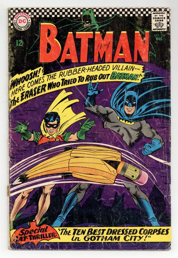 Cover pencils by Carmine Infantino, inks by Joe Giella. "The Eraser Who Tried to Rub Out Batman!", script by Robert Kanigher, pencils by Sheldon Moldoff (as Bob Kane), inks by Joe Giella; Commissioner Gordon gets Batman to investigate a series of crimes in which all of the clues have been erased, and the Caped Crusader goes undercover to do so. Cap's Hobby Hints activity half-page by Henry Boltinoff. "The Ten Best-Dressed Corpses in Gotham City!", script by John Broome, pencils by Sheldon Moldoff (as Bob Kane), inks by Sid Greene; A newspaper publisher calls in the Police and Batman, explaining to them that three of the men on his magazine's top-ten best dressed list have been murdered; Batman agrees to investigate and nearly dies himself as Bruce Wayne, who also was listed on the newspaper's listing. 36 Pages, Full Color. Cover price $0.12.