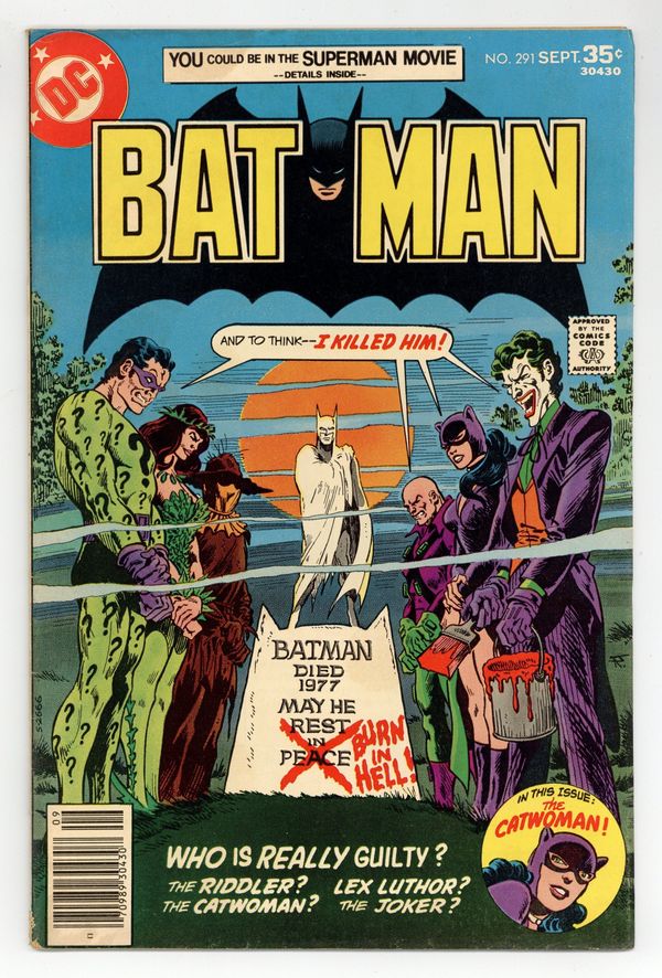 Cover art by Jim Aparo. The first installment of the "Who Killed Batman?" storyline: "Where Were You on the Night Batman Was Killed?: The Testimony of the Catwoman!", script by David Vern (as David V. Reed), pencils by John Calnan, inks by Tex Blaisdell; When word spreads throughout the underworld that Batman has been killed, several villains take credit for the deed; So the villain community sets up a trial to test the various claims, with Ra's al Ghul acting as judge and Two-Face acting as prosecutor; First up is the Catwoman; But Two-Face finds the technical error in Catwoman's story and she is dismissed. Letter from comics artist Adam Castro. Swamp Thing from the Beginning article by Jenette Kahn. 36 Pages, Full Color. Cover price $0.35.