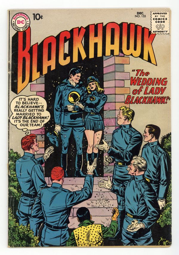 Cover by Dick Dillin & Charles Cuidera. Stories by Dave Wood, Jack Miller and unknown. Art by Dick Dillin, Charles Cuidera and Sheldon Moldoff. Three stories! "Killer Shark's Land Armada" - Killer Shark uses decoys to commit crimes on land. Plus: "The Wedding of Lady Blackhawk" - Zinda and Blackhawk get married, but the rest of the Blackhawks are jealous. And: "The Clown Prince of Crime" - Jo-Jo the clown decides to use clown stunts to disrupt the theatre, movies and television because he blames them for the decline of circuses. Also: 1-page text story "Tide of Victory"! 32 pages, full color. Cover price $0.10.