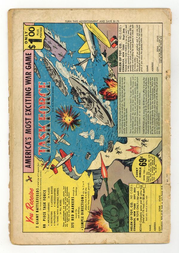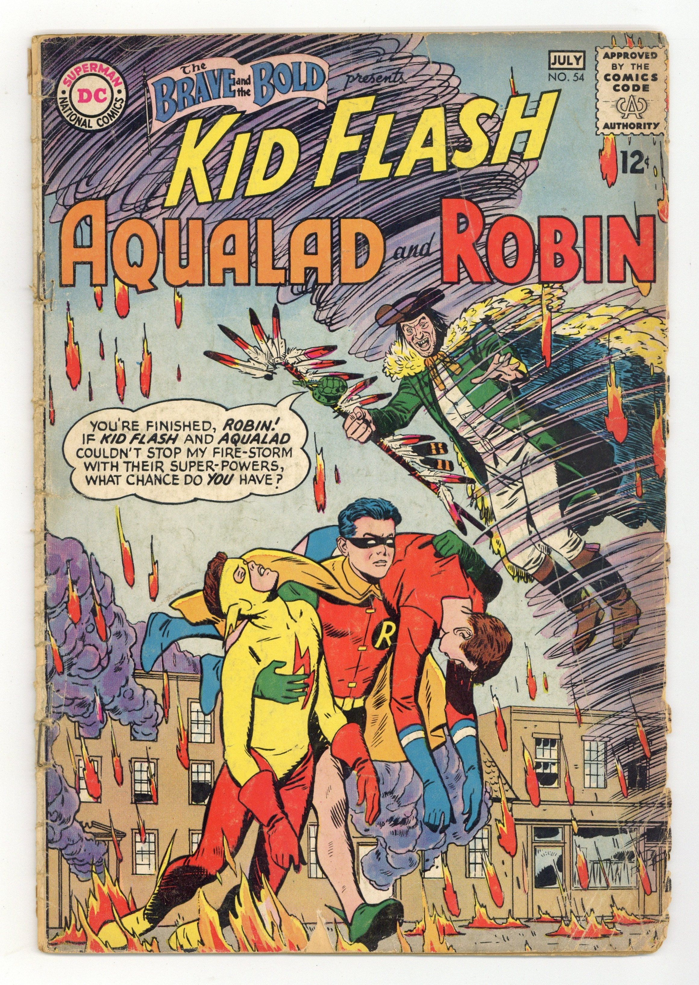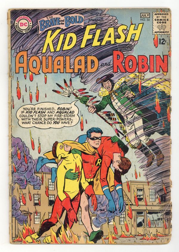 Cover by Bruno Premiani. 1st appearance and origin of the Teen Titans (Robin, Kid Flash, Aqualad) in "The Thousand-and-One Dooms of Mr. Twister," script by Bob Haney, art by Bruno Premiani; The townsfolk of Hatton Corners is in the midst of a dispute; The adults of the neighborhood feel that the teen populace are too wild and unruly, whereas the teens feel that the adults are too "un-hip" and incapable of relating to teenage problems; Ironically, the teen youth movement is led by Eddie Corliss, son of the town's mayor; Eddie organizes a club house meeting and invites three famous teen super-heroes to come to Hatton Corners to support their cause; They invite Aqualad, Kid Flash and Robin; Before the heroes arrive however, a crazed super-villain known as Mister Twister blusters through town riding atop a giant cyclone. Cap's Hobby Center by Henry Boltinoff. 36 Pages, Full Color. Cover price $0.12.