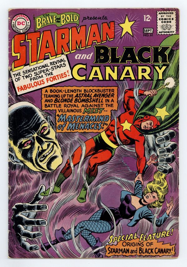Cover by Murphy Anderson. "Mastermind of Menaces," script by Gardner Fox, art by Murphy Anderson; The villainous Mist returns to his life of crime by using flowers from Dinah Drake's floral shop to hypnotically induce wealthy people into parting with large sums of money, and when Starman gets involved in the case, the Mist figures out a way to nullify his famed Gravity Rod. The Origin of Starman article by Julius Schwartz, art by Jack Burnley. The Origin of Black Canary article by Julius Schwartz, art by Carmine Infantino. 36 Pages, Full Color. Cover price $0.12.