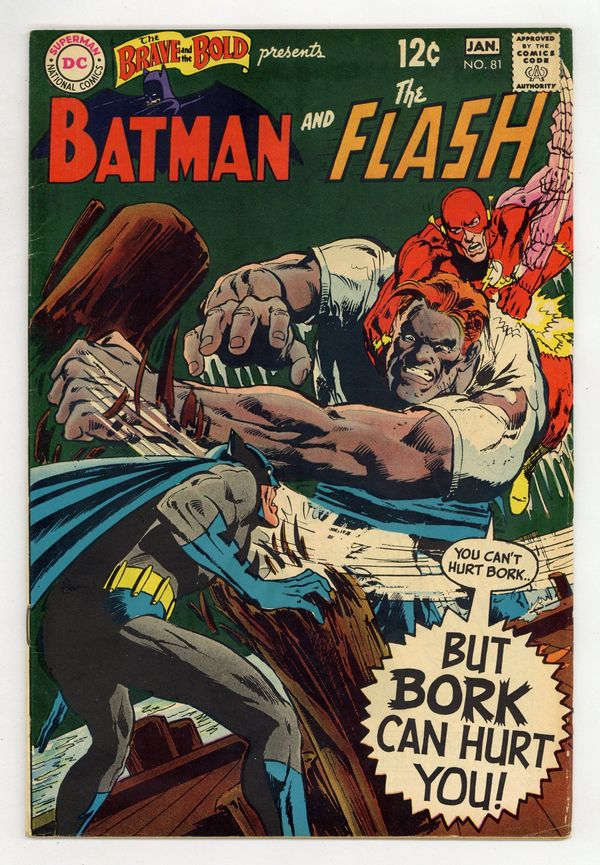 Cover by Neal Adams. "But Bork Can Hurt You!", script by Bob Haney, pencils by Neal Adams, inks by Dick Giordano and Vince Colletta; When mercenary for hire named Bork arrives in Gotham City and realizes that he's mysteriously invulnerable, he begins a campaign to take over the city, even besting Batman in combat; While Batman is trying to stop Bork and his followers, Batman sends the Flash on a quest to find the source of Bork's power; Flash finds it in a wooden statue carved into Bork's likeness, however it appears to be equally invulnerable; Running it straight through the sun however destroys it; With the source of Bork's power destroyed, Batman is able to defeat him in single combat. Bork is then turned over to the authorities. 36 Pages, Full Color. Cover price $0.12.