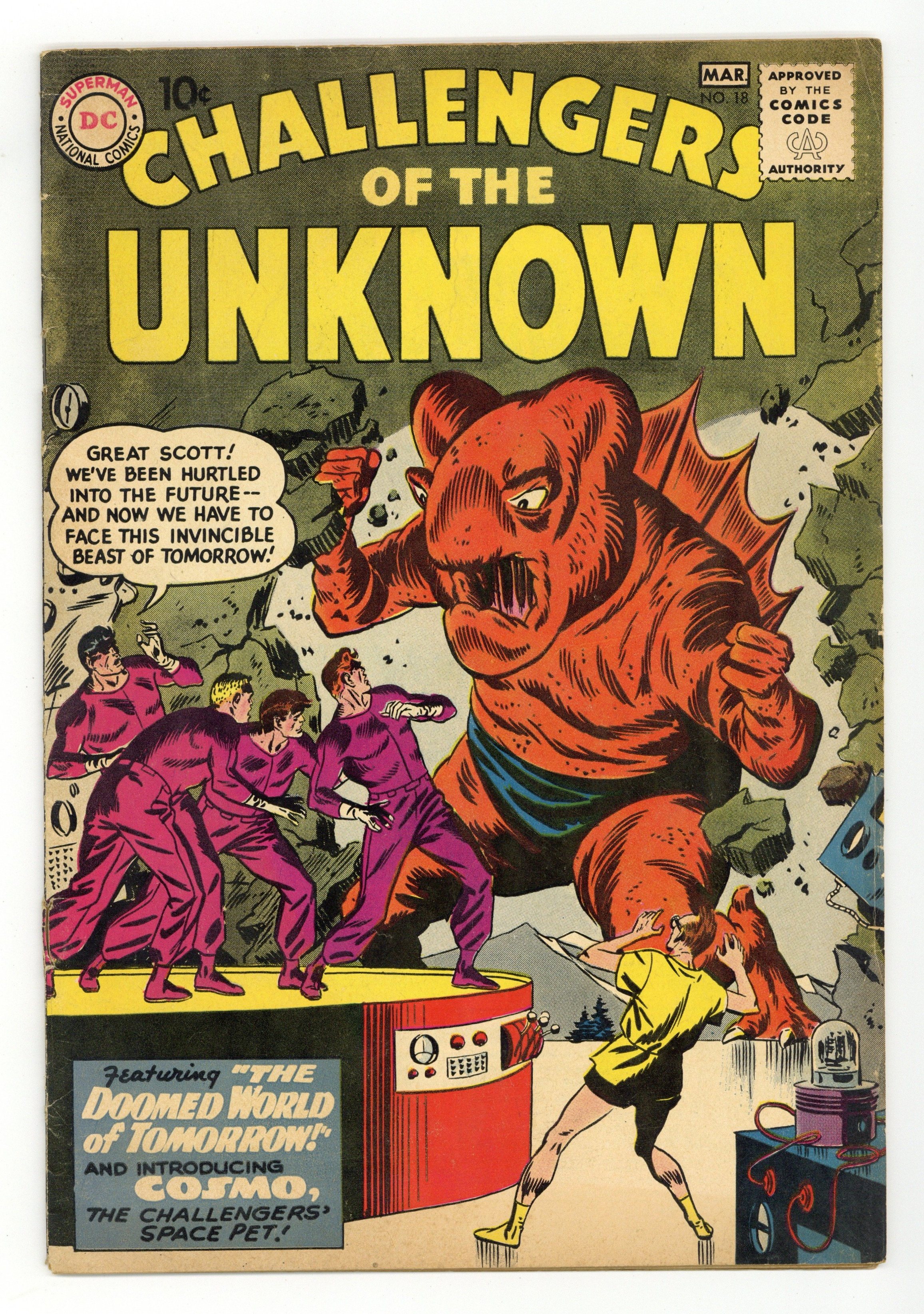 "The Menace of Mystery Island." The Challengers, on their way to an island that June has inherited, discover a mysterious alien pet in a space capsule from another planet. "The Doomed World of Tomorrow." The Challengers help future Earthlings battle cosmic creatures. Art and cover by Bob Brown. Statement of ownership--average paid circulation 228,000. Full-page ad for Justice League of America # 3. Cover price $0.10.