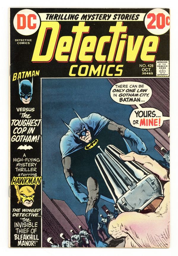 Tags: Batman$18.50Cover by Mike Kaluta. "The Toughest Cop in Gotham!", script by Frank Robbins, pencils by Bob Brown, inks by Dick Giordano; Steve Shotgun Smith enforces a tough line on Gotham pushers, but Batman suspects that he may be taking kickbacks. "The Invisible Thief of Bleakhill Manor!", script by E. Nelson Bridwell, pencils by Dick Dillin, inks by Joe Giella; Hawkman confronts a thief. Letter from comics writer Bob Rozakis. 36 pgs., full color. $0.20. Cover price $0.20.